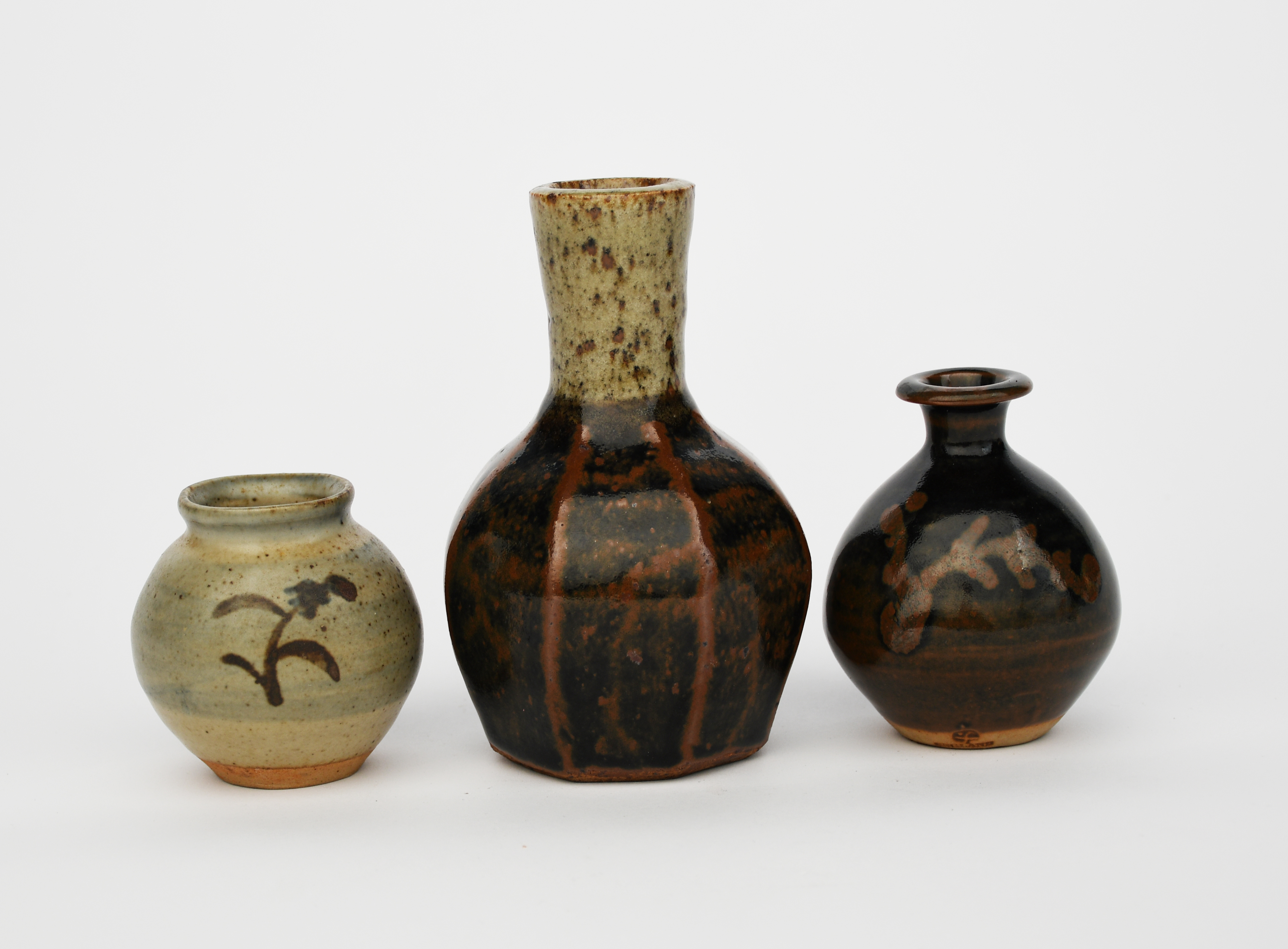 a Leach Pottery stoneware bud vase, 1958, facetted form with slightly flaring cylindrical neck, glazed tenmoku, the neck ash, and two smaller vases