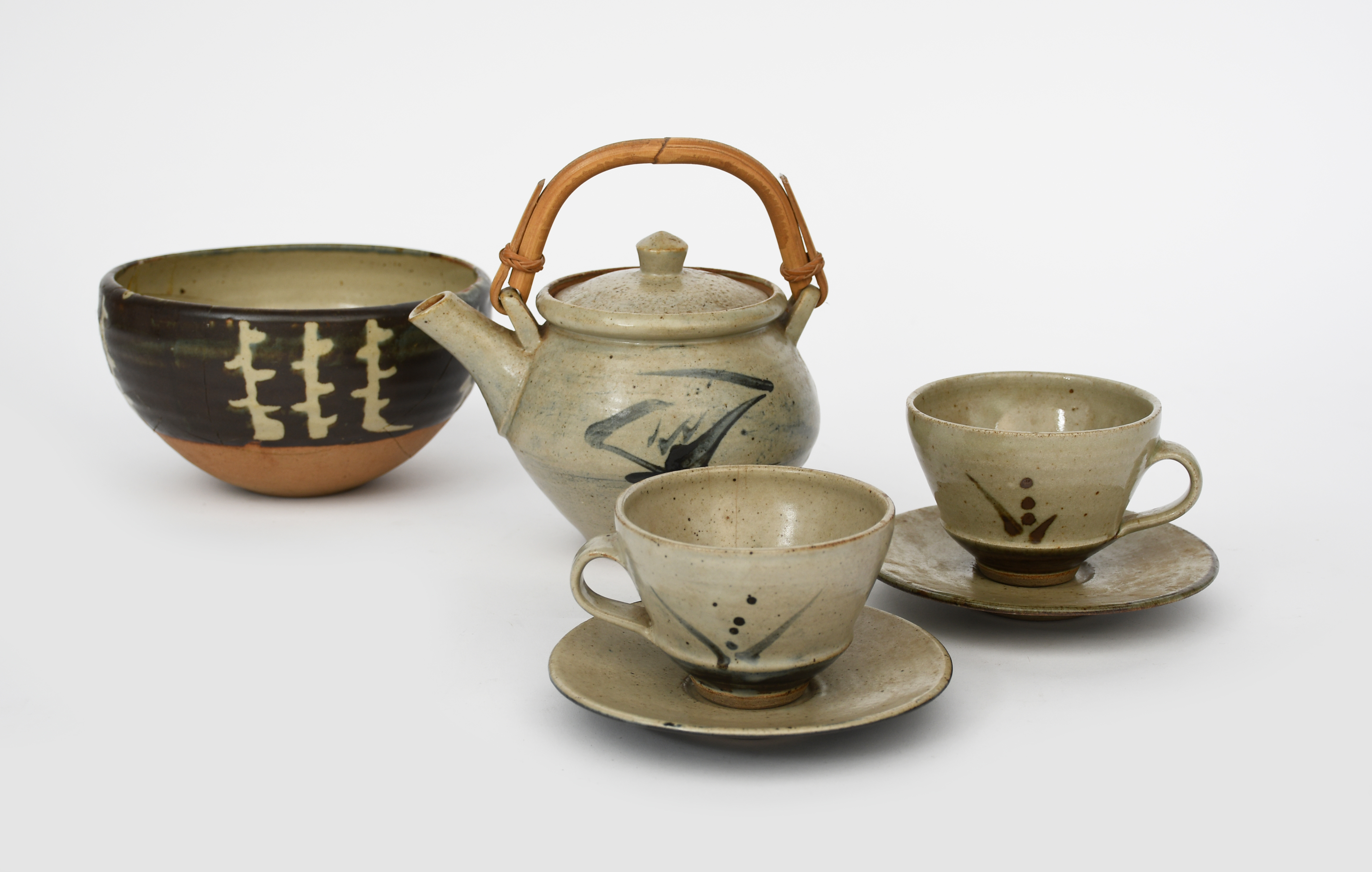 a Leach Pottery stoneware tea set for two, painted with simple brushed grass design in cobalt on an ash glaze, comprising teapot and cover, two cups and saucers, and a stoneware bowl by William Bill Marshall,