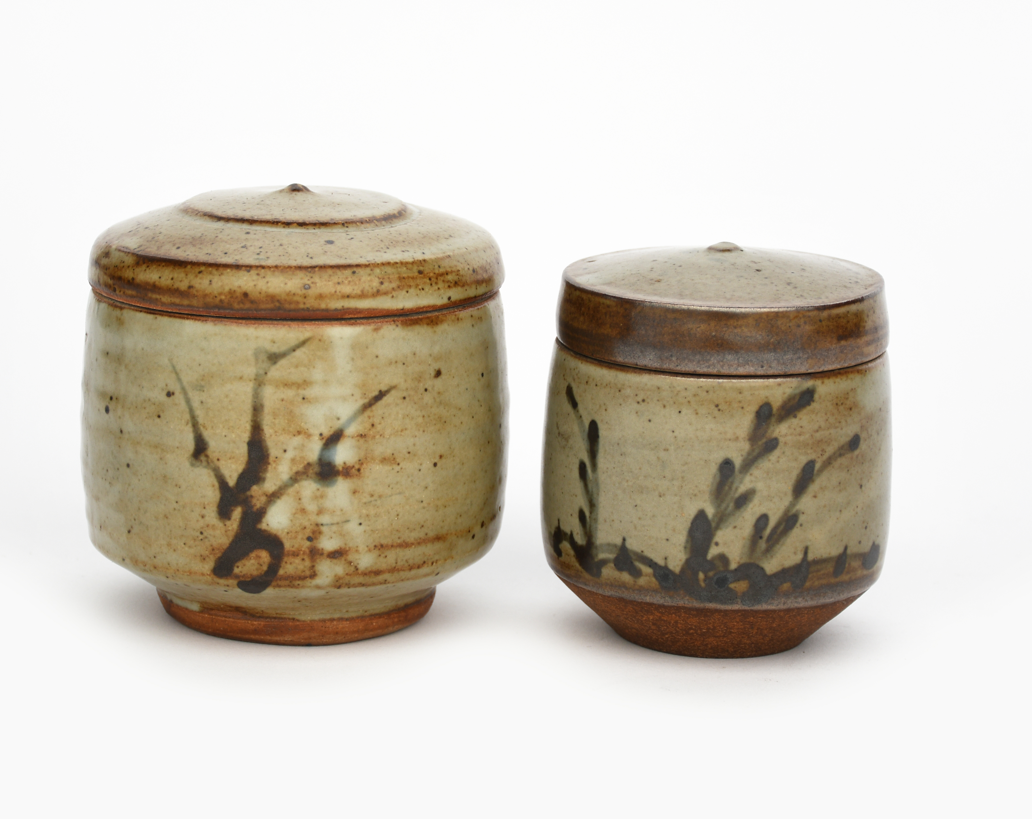 a Leach Pottery stoneware canister and cover, cylindrical form, painted simple brush grass motif on an ash glaze, and another smaller,