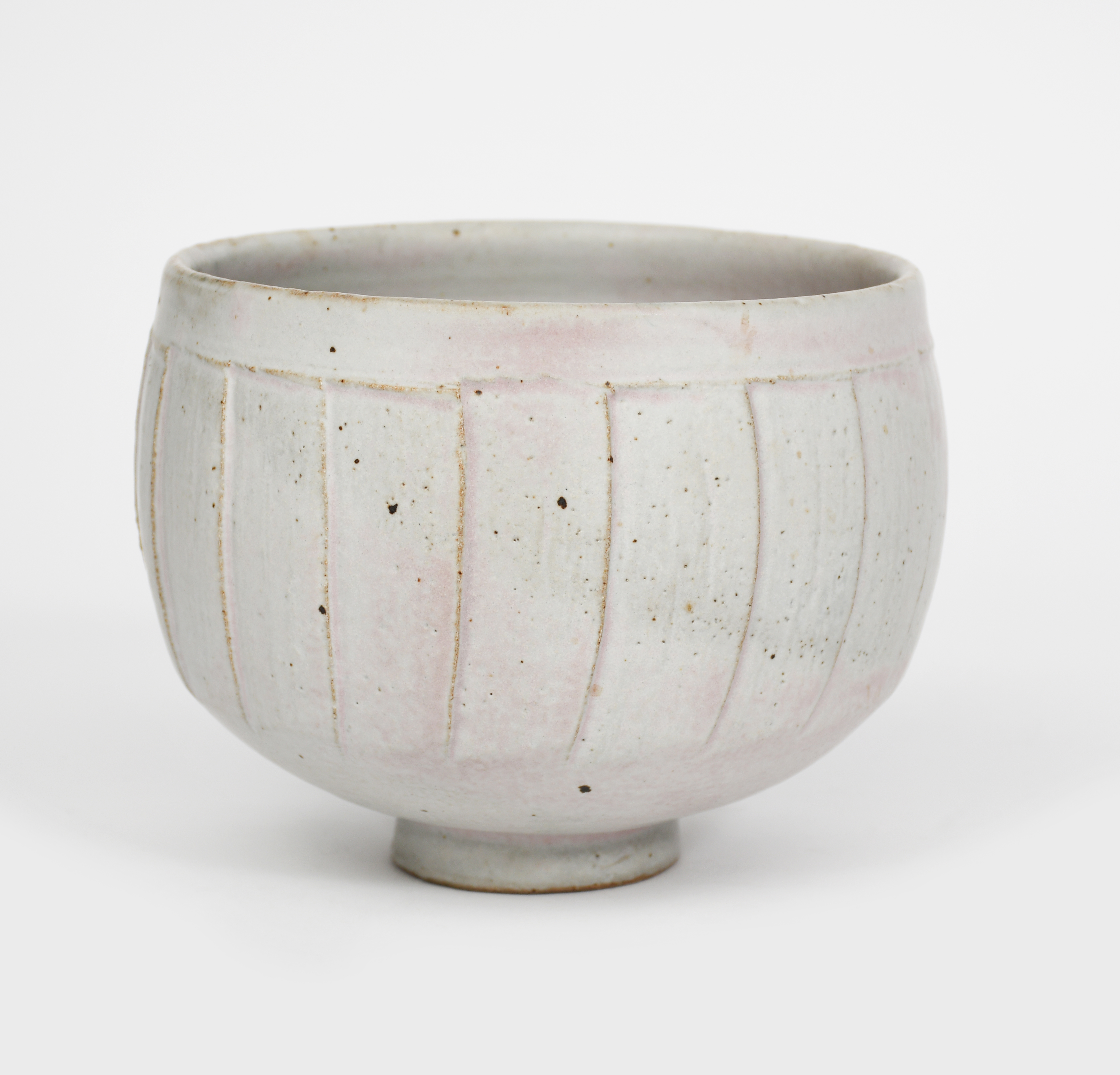 a cuts-sided stoneware bowl, footed , cylindrical form, covered in a matt pale blue glaze with pink blush,