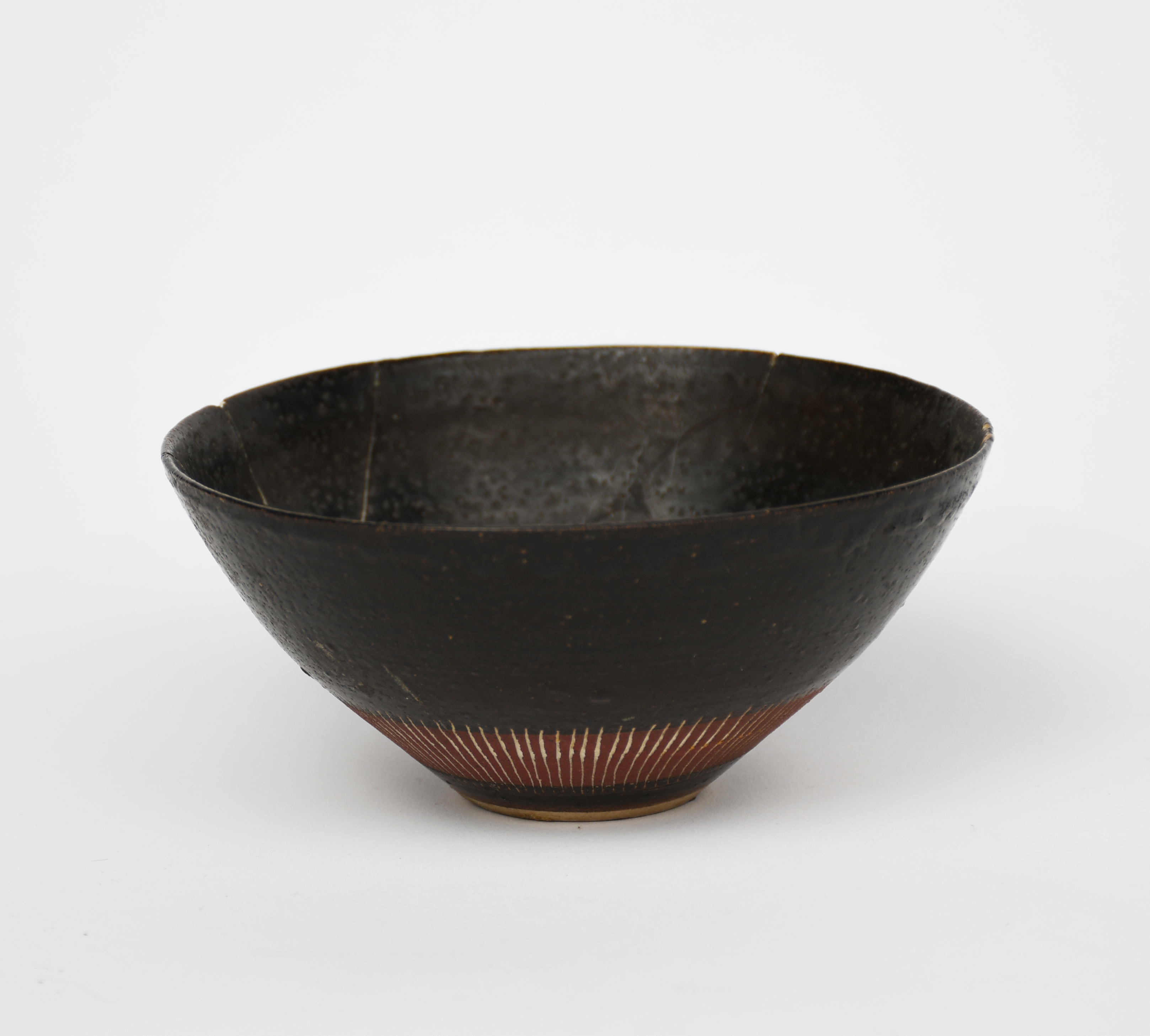 a small porcelain sgraffito bowl, flaring conical form, with terracotta band to foot and well, with incised sgraffito bands, covered in a manganese glaze