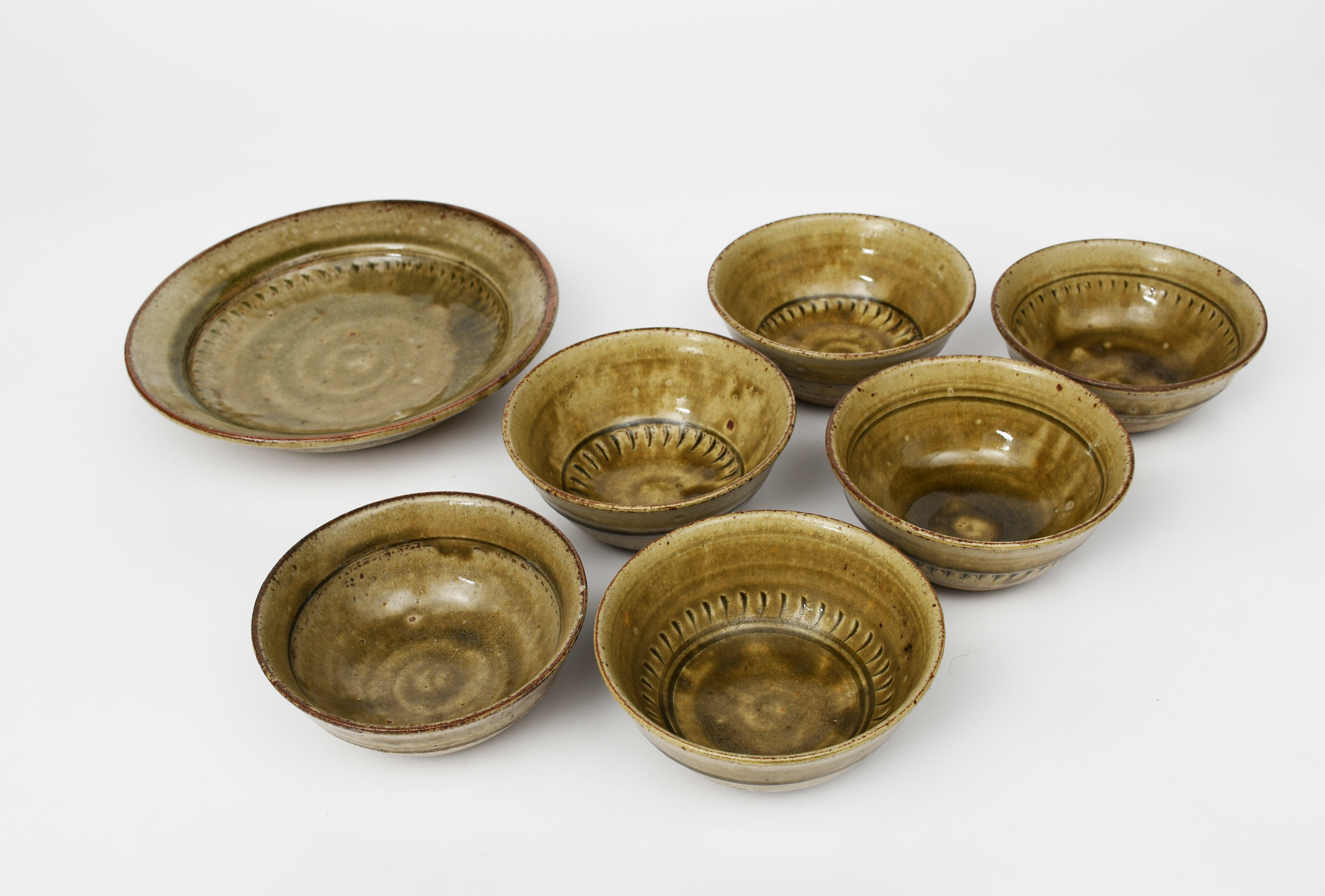 a stoneware plate with chatter bands, and six bowls, all covered with ash glaze,