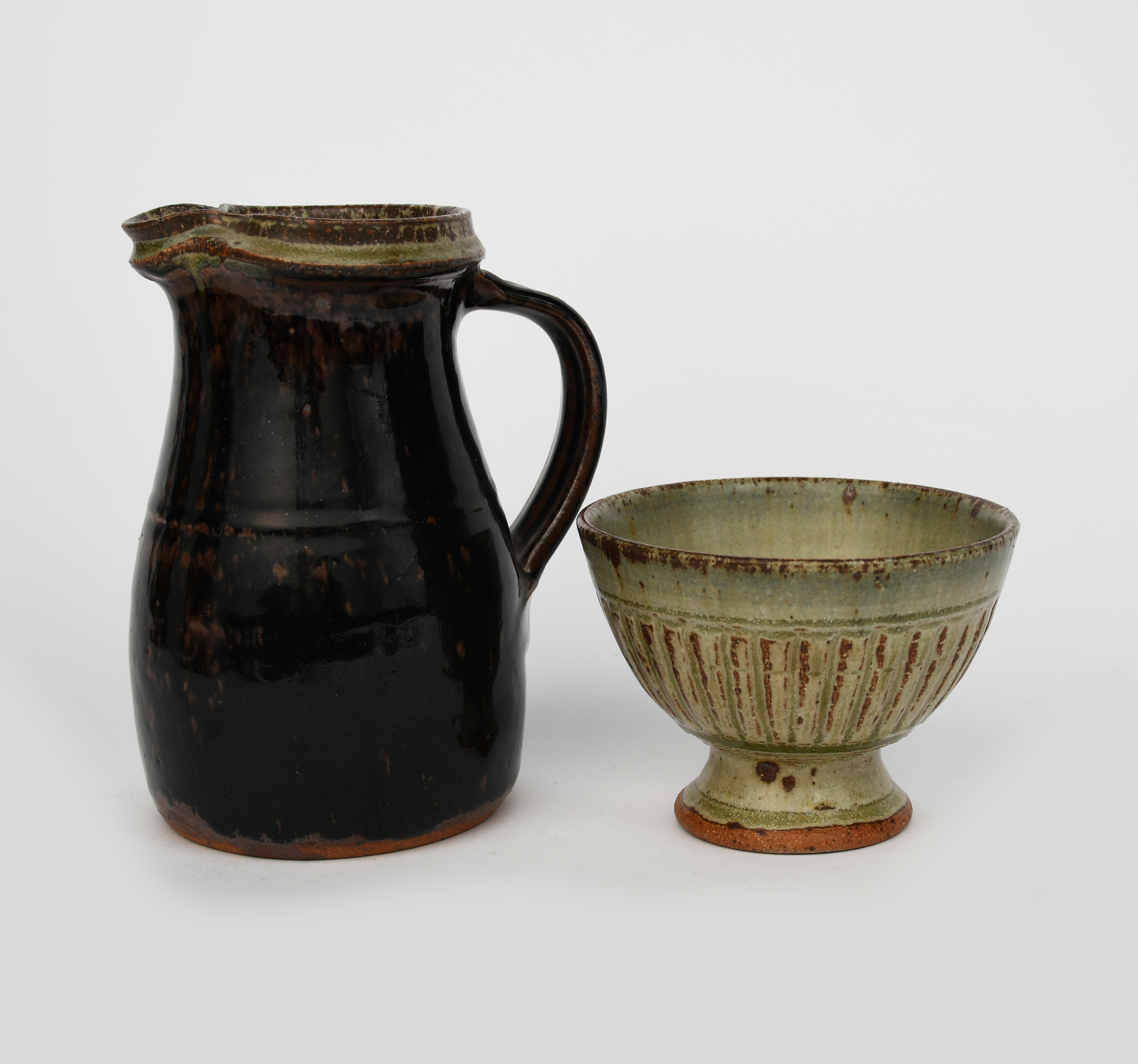 a stoneware jug, covered in a tenmoku glaze, the top rim glazed ash, and a footed bowl with cut flutes, glazed ash, by Richard Batterham