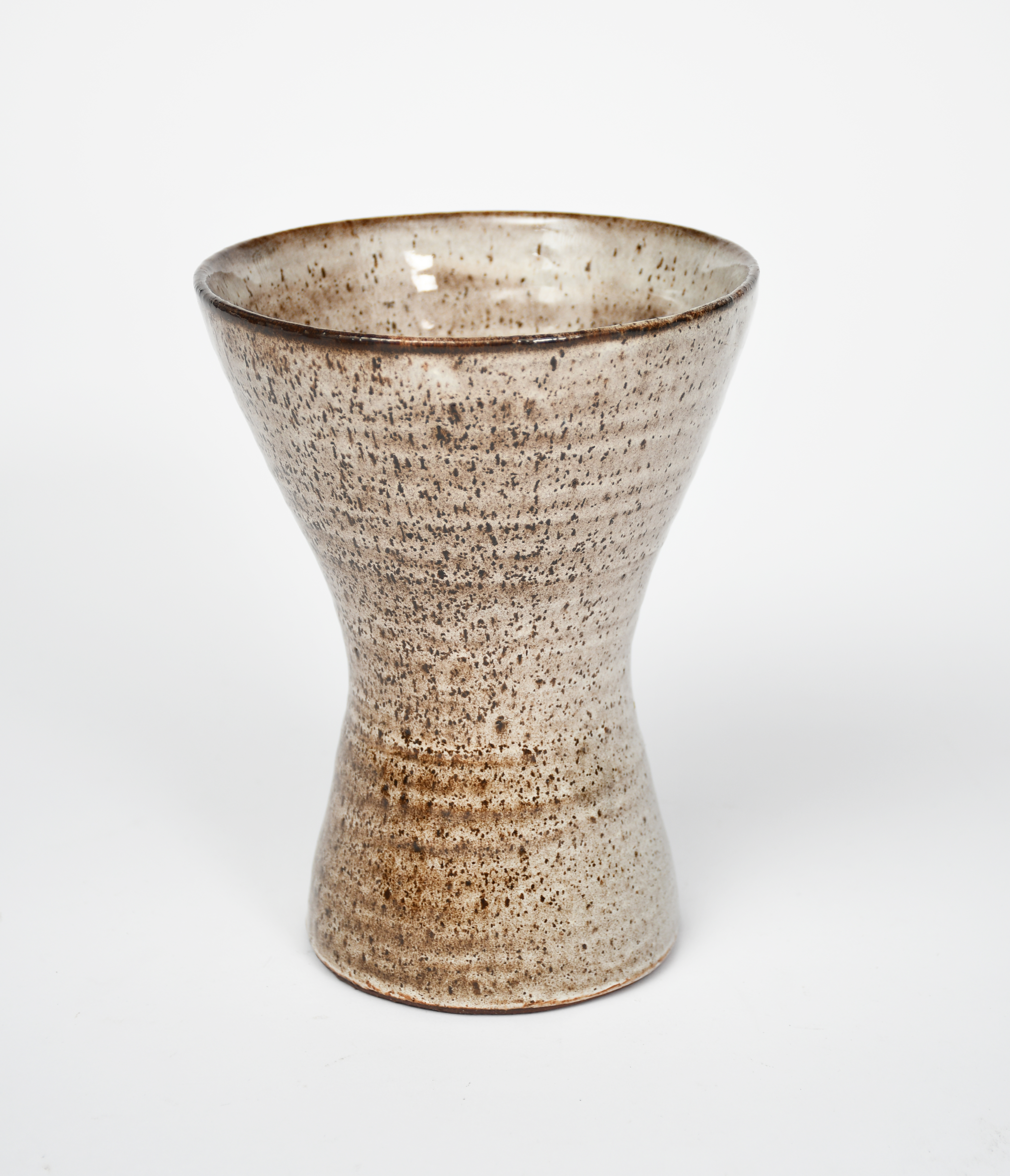 waisted cylindrical form, covered in a speckled tin-glaze mushroom ground,