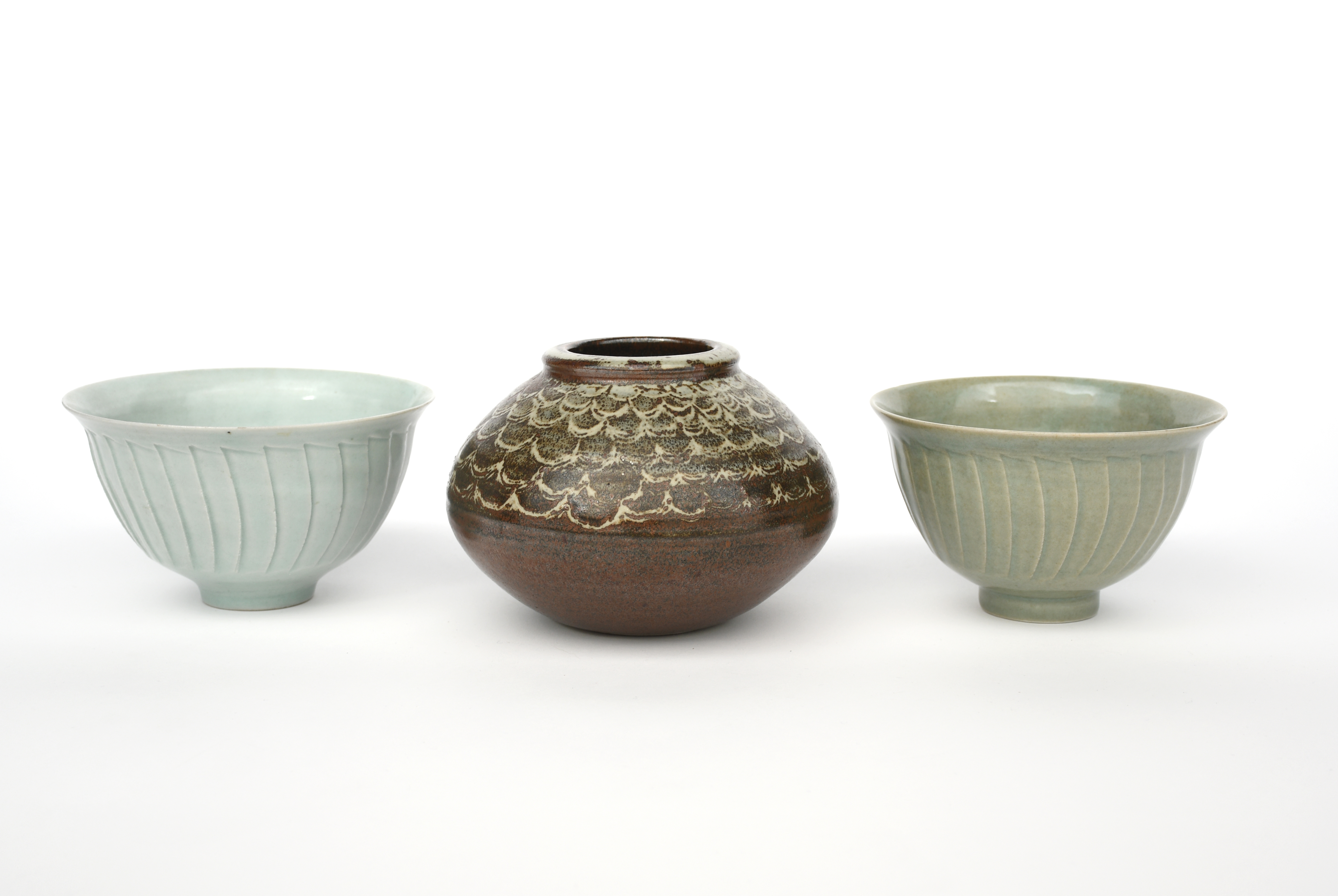 a Lowerdown Pottery stoneware vase, compressed form with collar rim, sgraffito decorated with overlapping motif to the shoulder, over tenmoku, and two Lowerdown Pottery cut-sided porcelain bowls by David Leach, covered in a pale blue celadon ground,