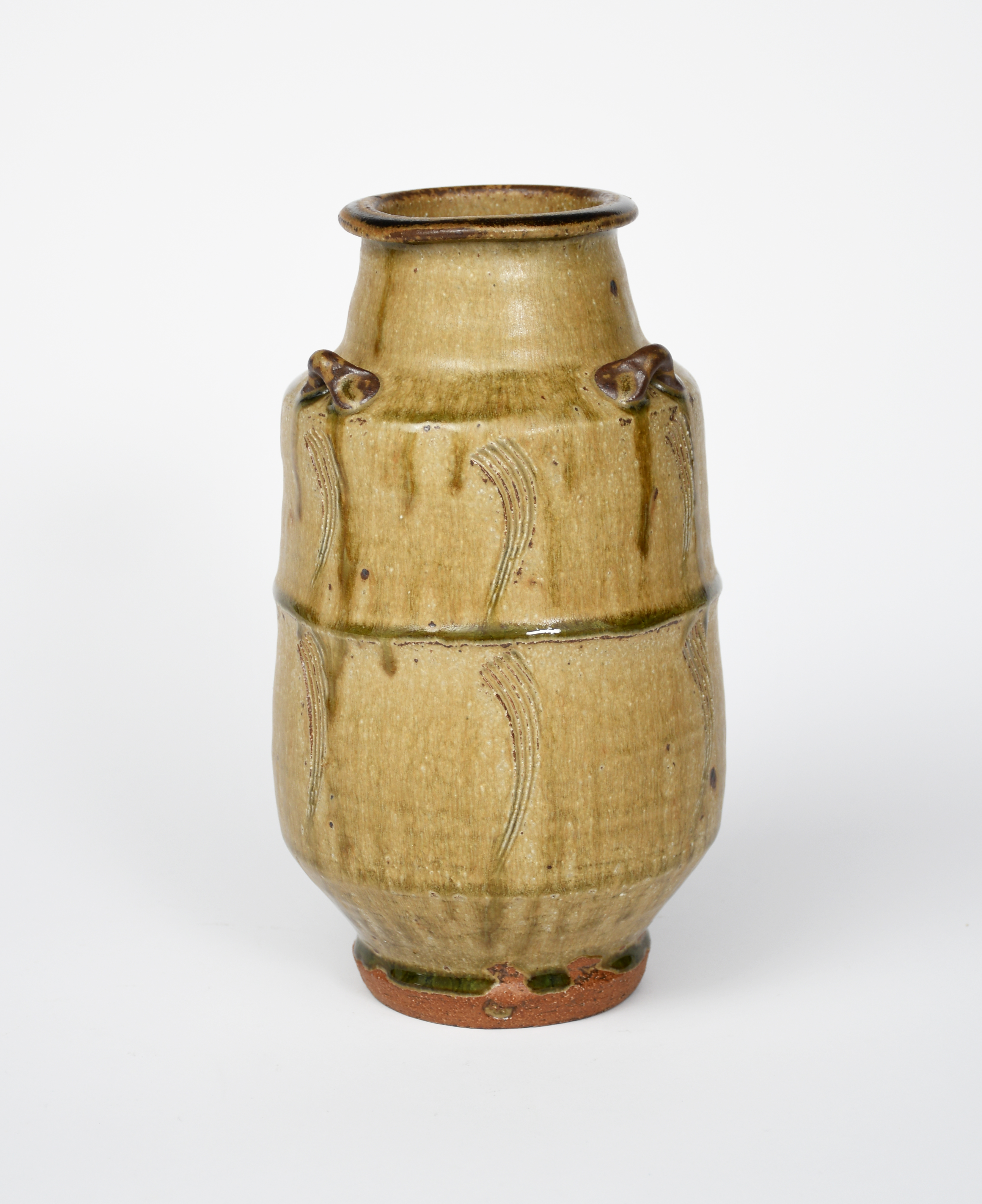 a stoneware vase with applied handles, shouldered form, with incised combed decoration, covered in an ash glaze and a salt-glazed stoneware jug, waisted form, with impressed repeat design, covered in a rich salt-glaze,