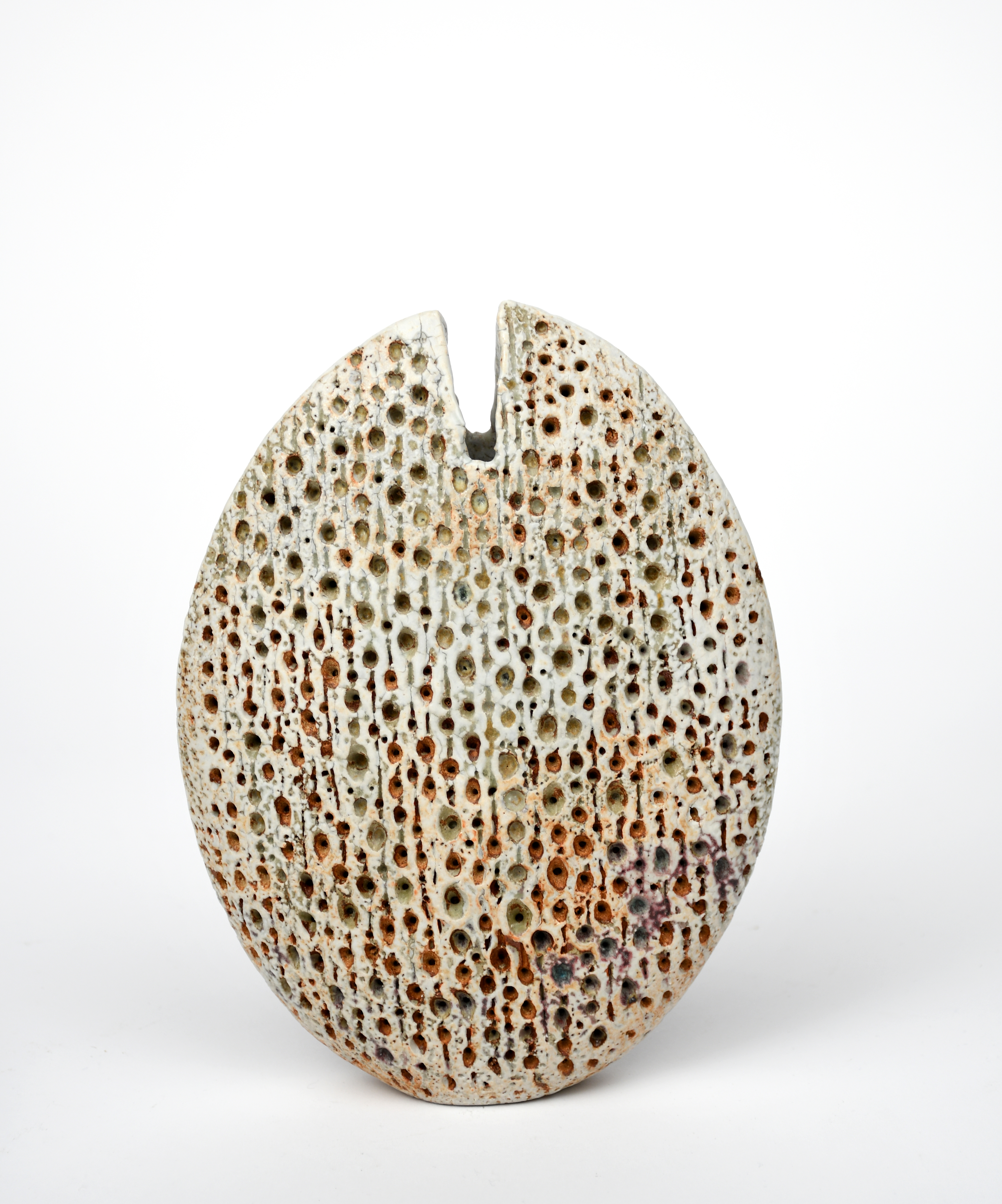 a stoneware vase, covered with impressed holes, glaze pale grey with rush highlights