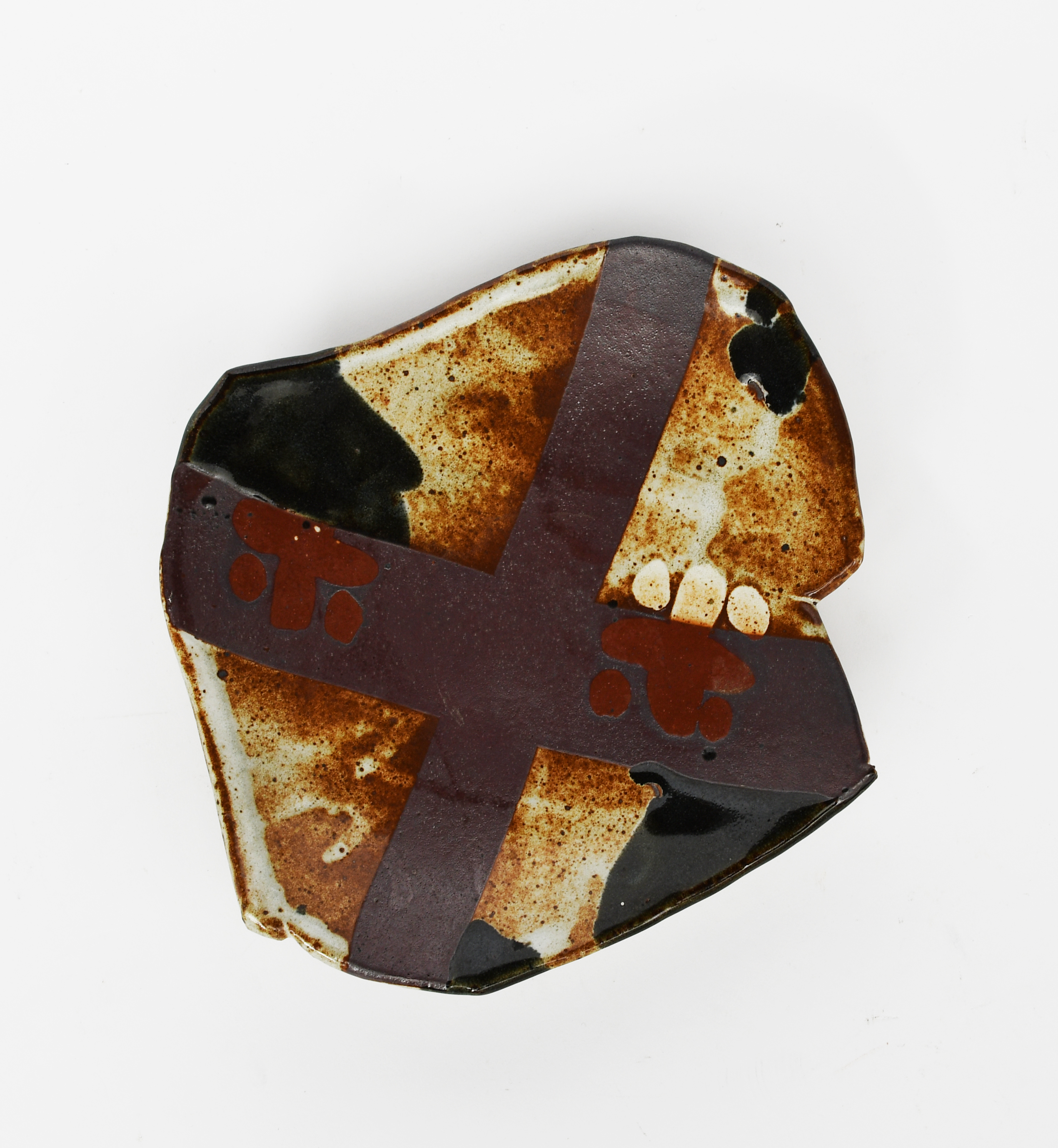 a stoneware footed dish, glazed with large cross motif, in shades of dark chestnut, red and white