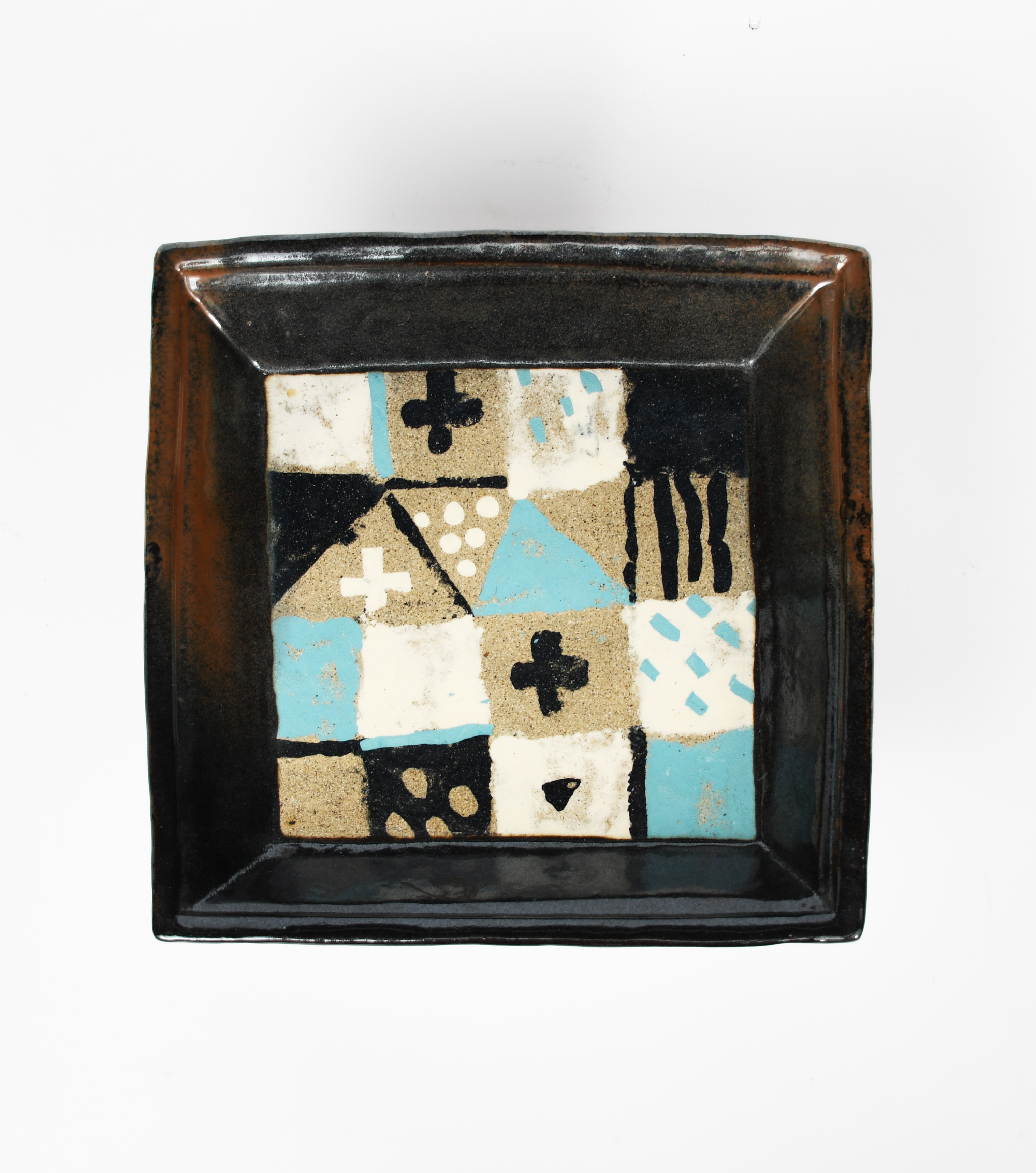 a large stoneware square plate with raised rim, painted to the well with houses and crosses, in blue, white and black on a speckled oatmeal ground, the rim glazed tenmoku,