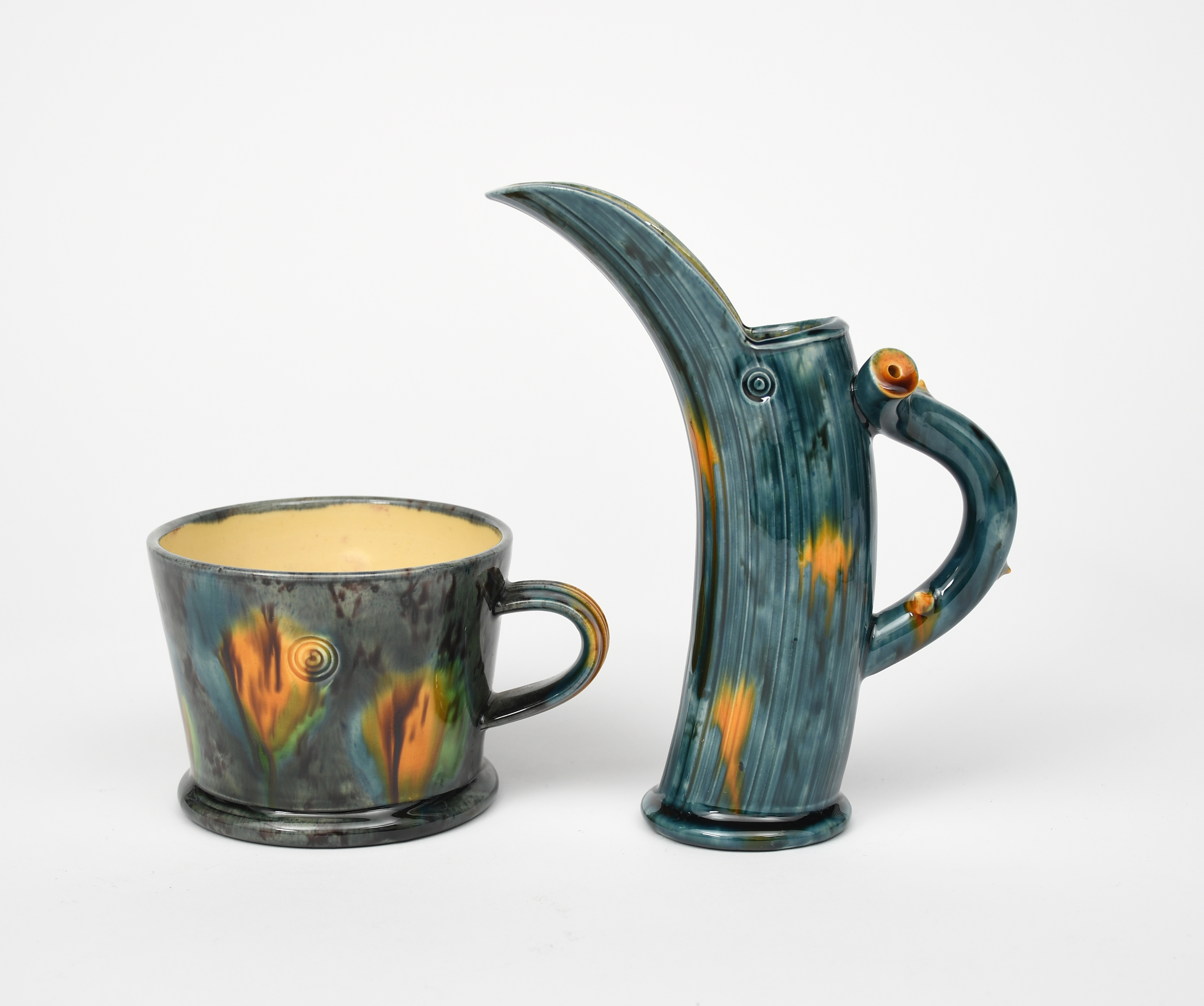 a Whieldon Ware stoneware extruded jug with thorn handle, glazed blue with yellow and green patches, and a mug similar,