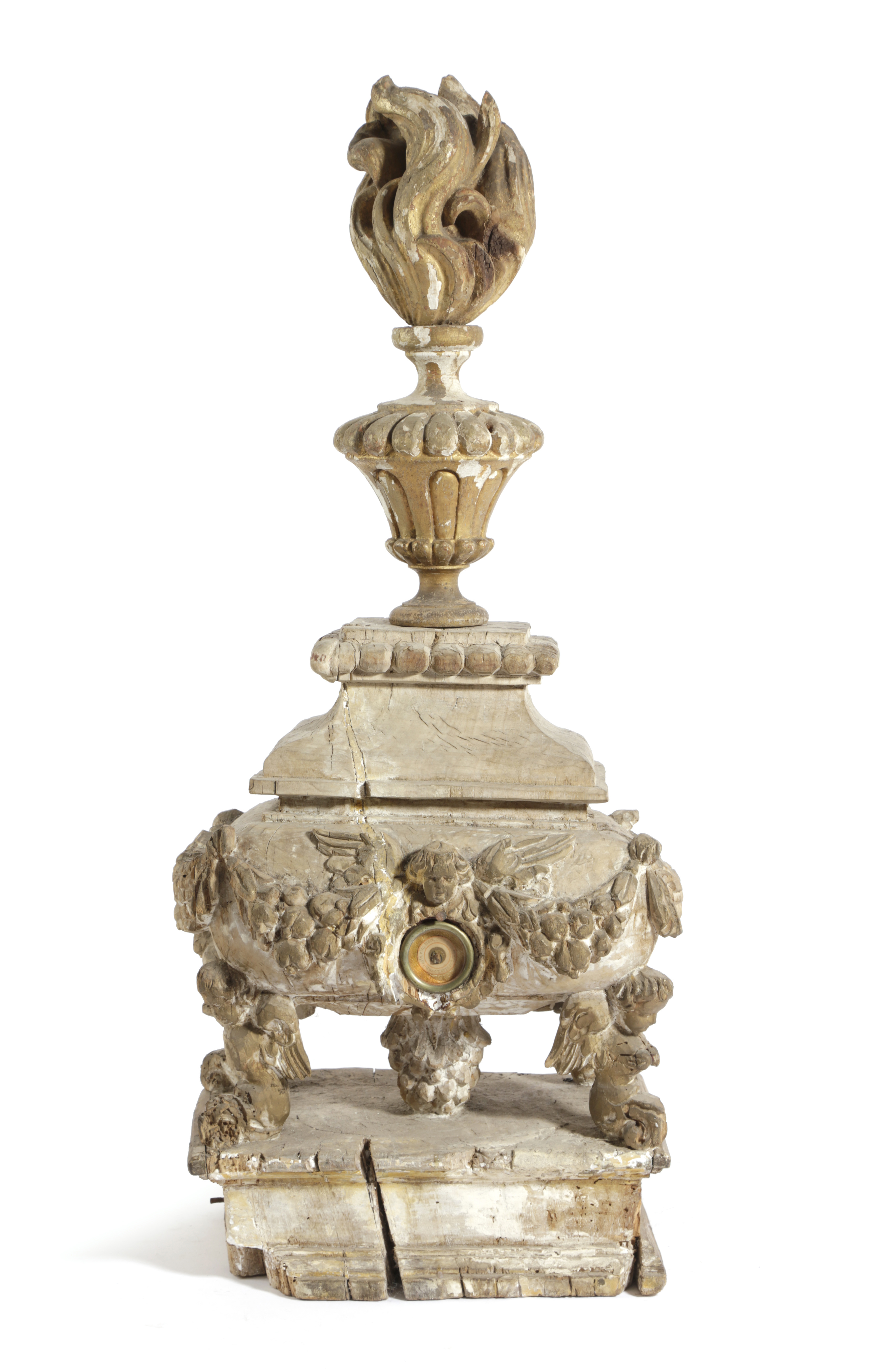 the central relic surrounded by cherubs and floral swags, beneath a gilt flaming urn finial and a rectangular base