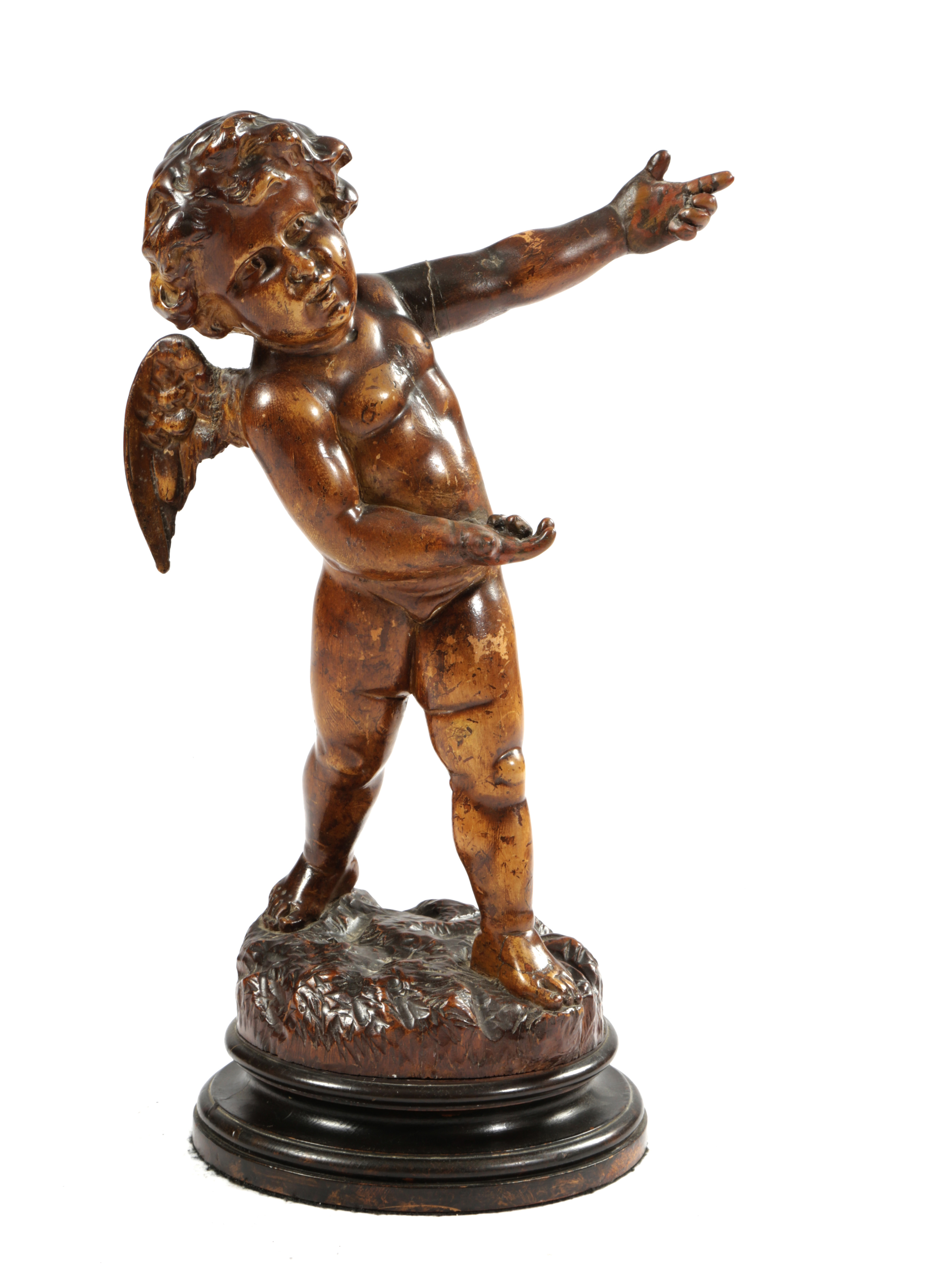 AN ITALIAN CARVED AND STAINED LIMEWOOD FIGURE OF A CHERUB