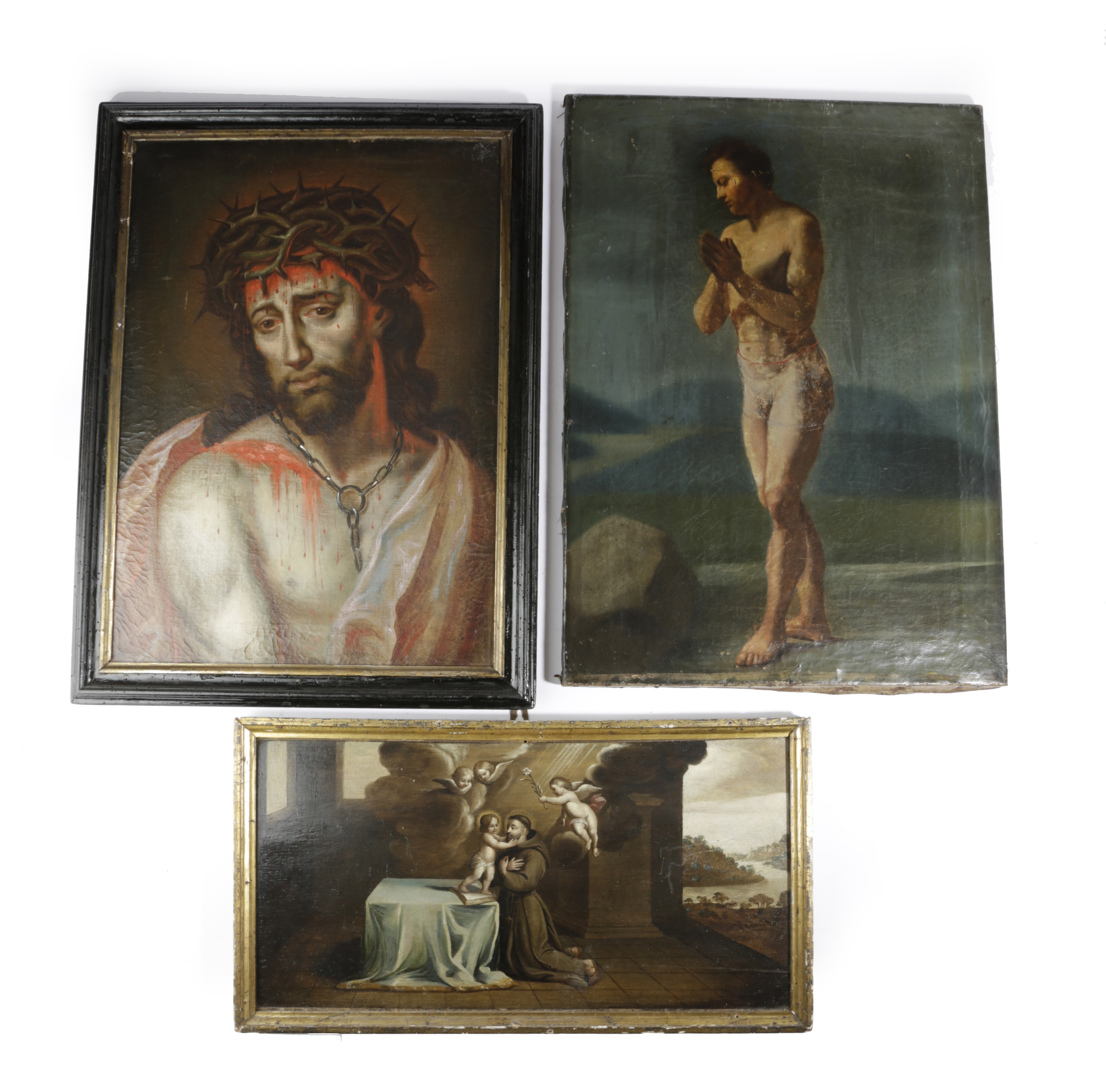 an interior scene of the Saint with a vision of the Christ Child surrounded by cherubs, oil on panel, together with an oil on canvas of 'Ecce Homo' and another of a standing nude (3)