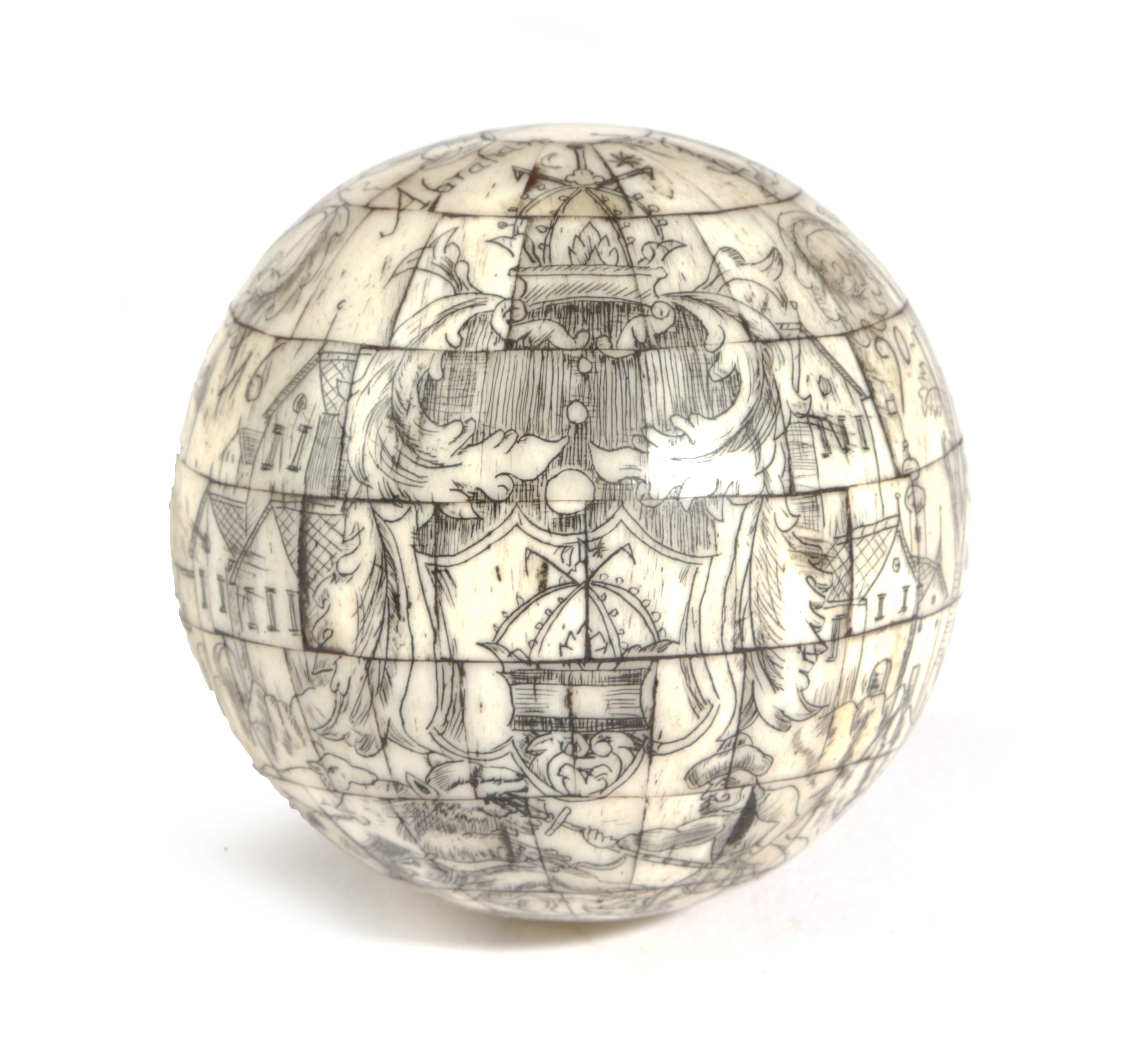 A BONE SCRIMSHAW GLOBE decorated with a...