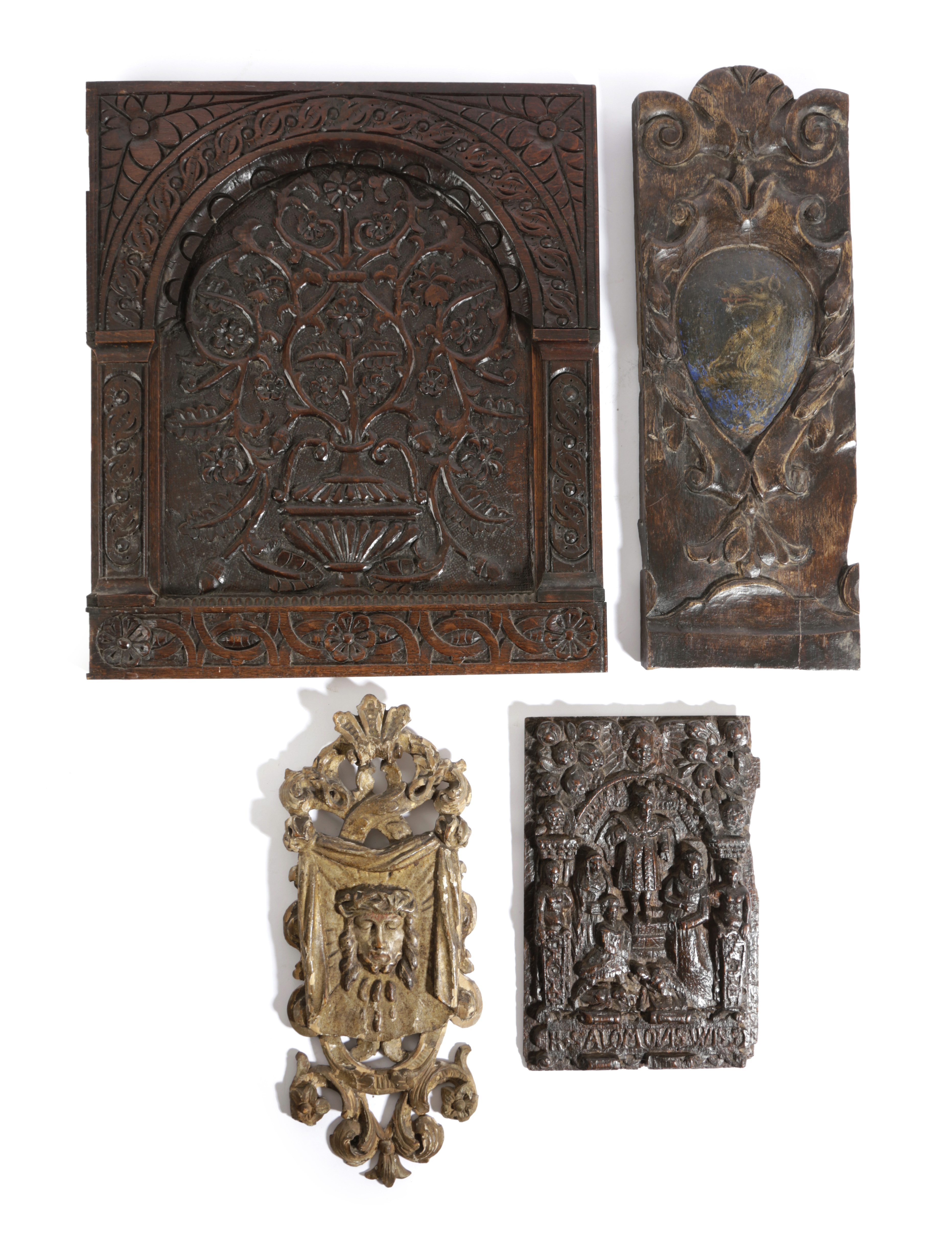relief carved with the Judgement of Solomon in an arch with an angels mask, term figures and flowers, inscribed 'K. Salomon Swiss'; together with a 17th century oak panel, carved with a flowering plant issuing from a vase, in a later frame, an Italian walnut carved panel painted with an armorial crest in a foliate cartouche and a carved, painted and parcel gilt limewood panel with a the head of Christ surrounded by drapes on scrolling strapwork and foliage (4)