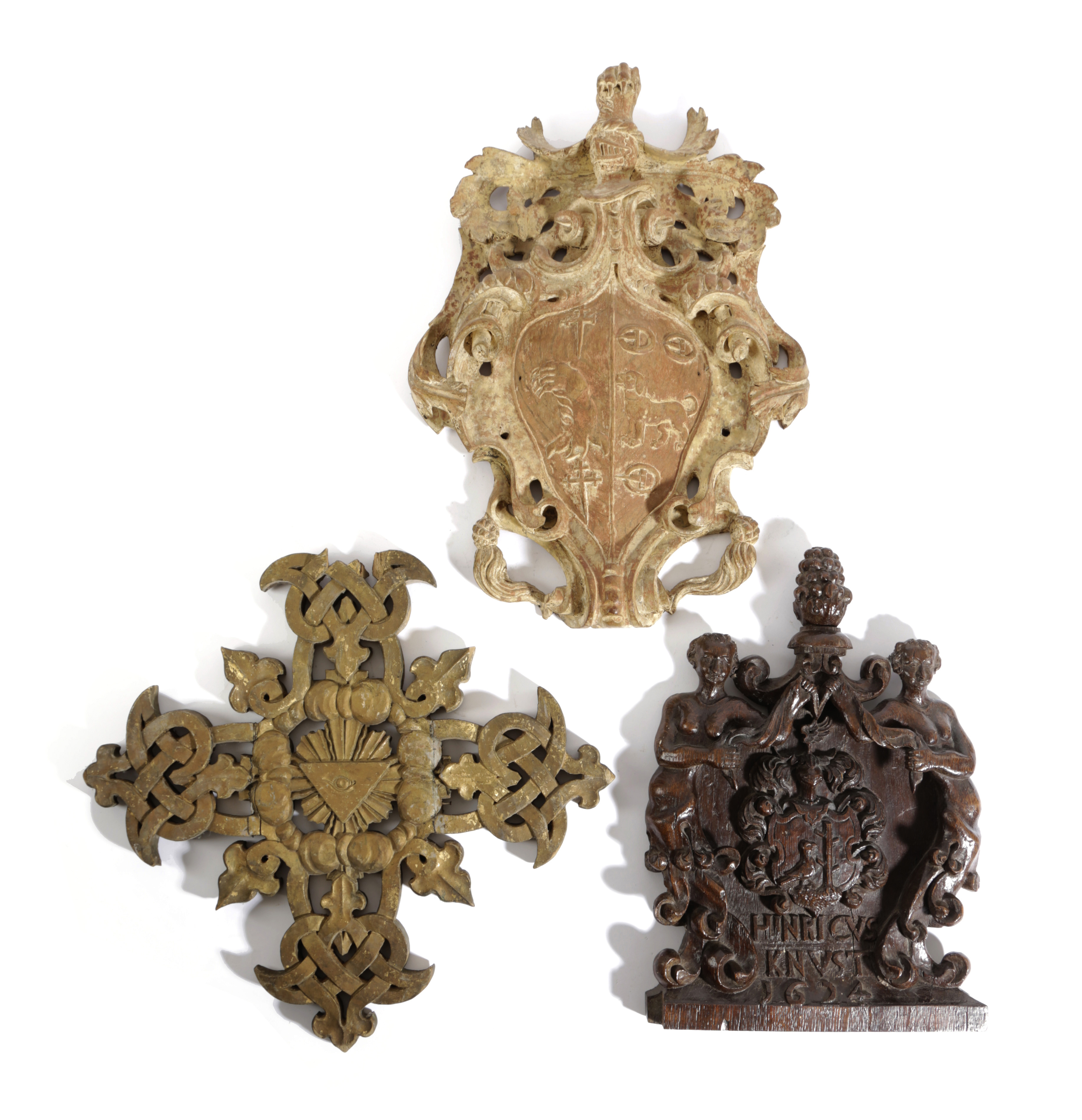 carved with a cone finial above a pair of mermaids flanking a coat of arms and inscribed 'Henricus Knust 1624', together with a carved and painted oak crest with a shield inside scrolling foliage and beneath a helmet and lion paw and a carved giltwood cross, of Masonic interest, with a central 'Eye of Providence' on a sunburst surrounded by clouds and scrolling knotted arms (3)