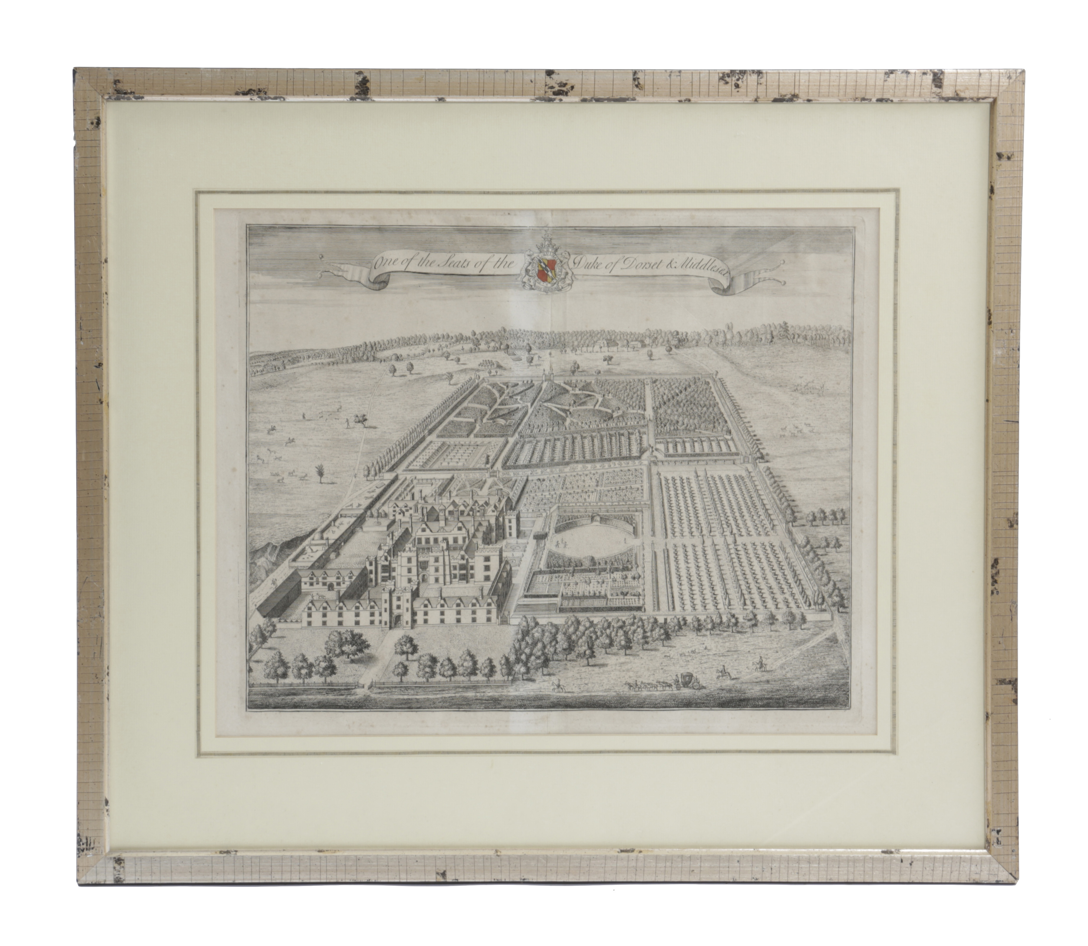 of 'Badminton the Seat of the Duke of Beaufort', after Kip, together with 'Hammels in the County of Hertford' by J Harris, 'Leyton Grange in the County of Essex' by J Schijnvoet and another titled 'One of the Seats of the Duke of Dorset & Middlesex', and two late 17th / Early 18th century maps titled 'Ducatus Luneburgici et Comitatus Dannebergensis and Circulus Saxoniae Inferioris' by J.P. Homanni (6)