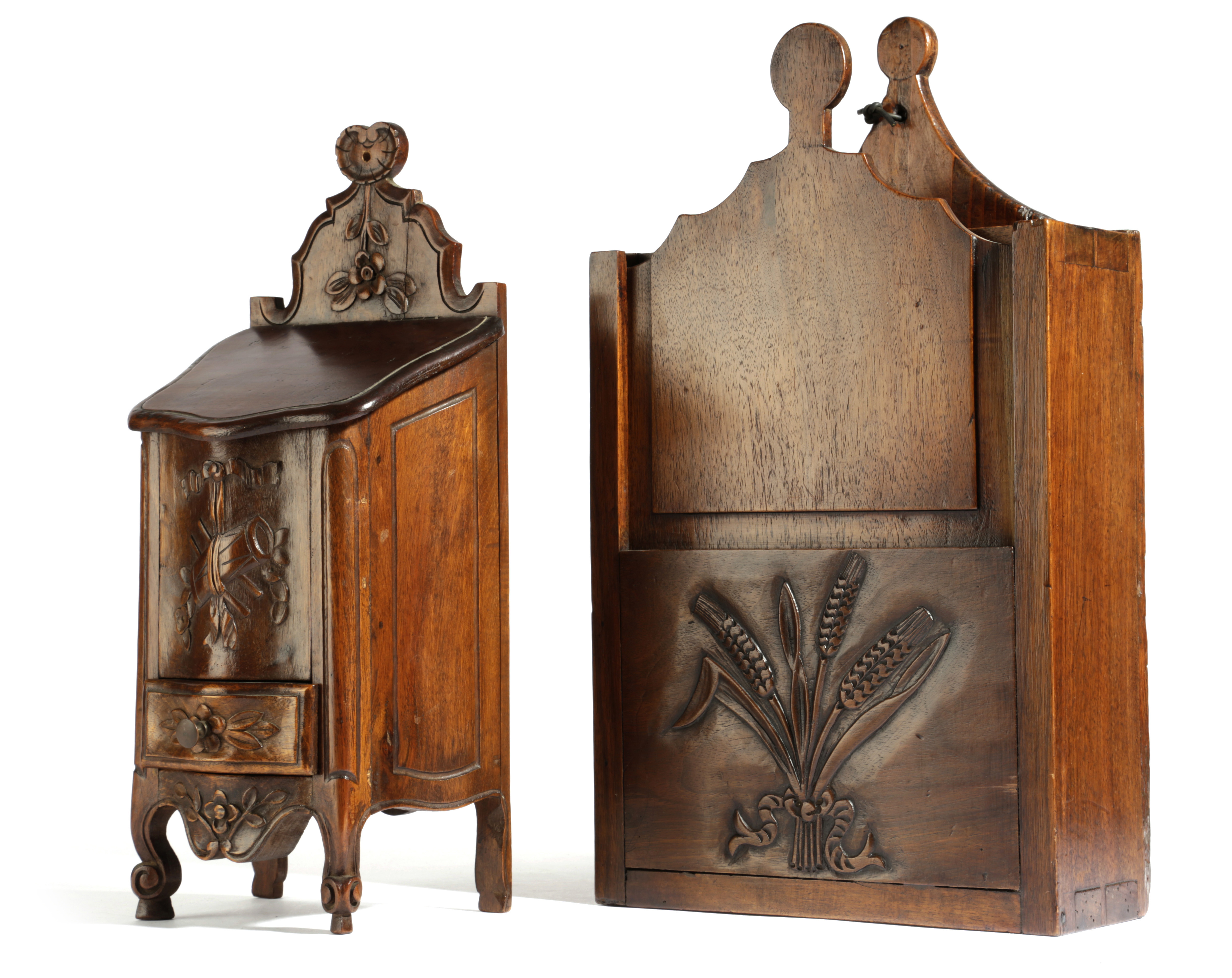 with a sliding cover and carved with heads of corn and another in the form of a serpentine miniature cabinet on cabriole legs (2)