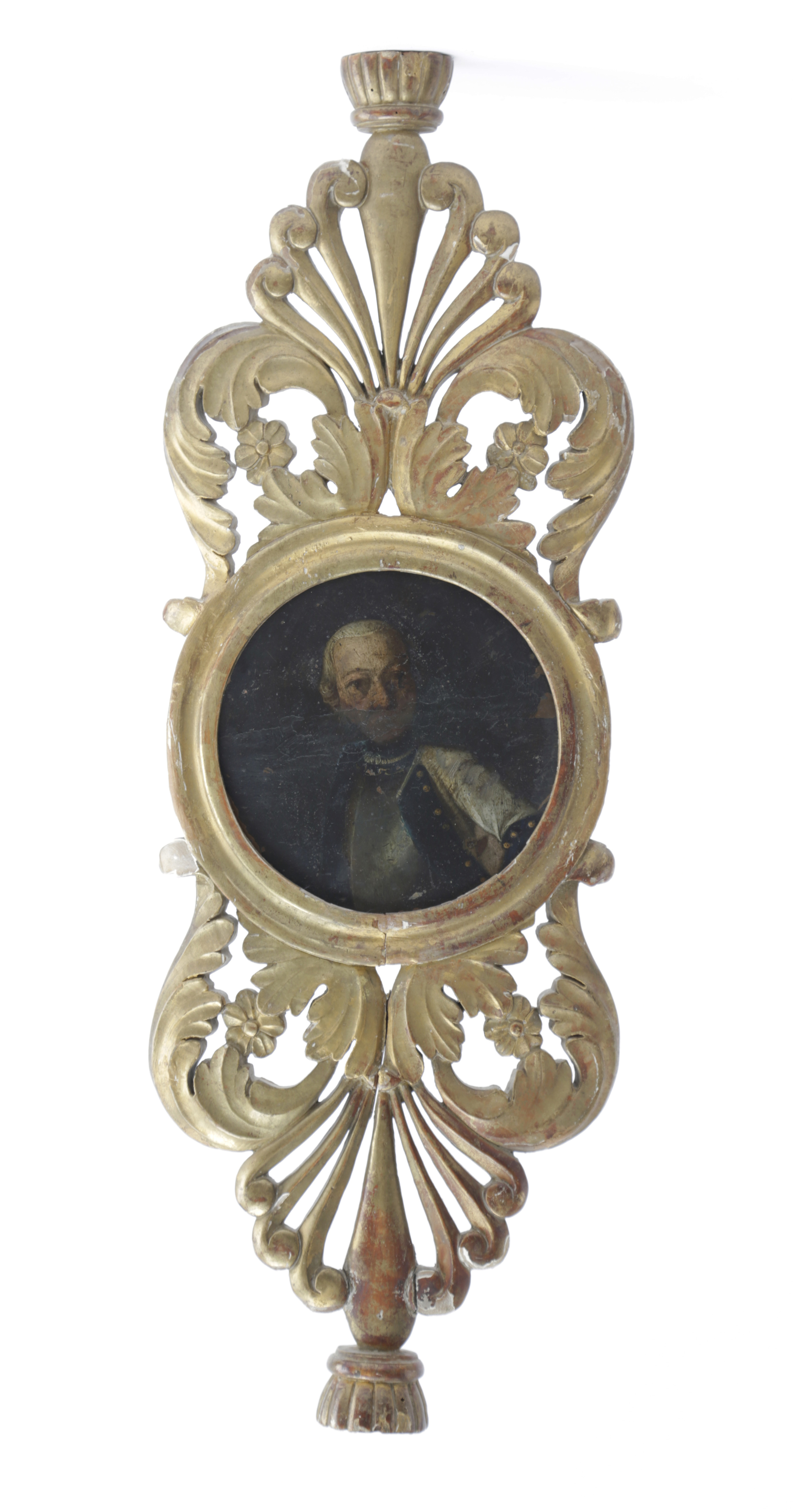 carved with anthemions, tassels and scrolling foliage around a circular oil on copper portrait of a naval officer