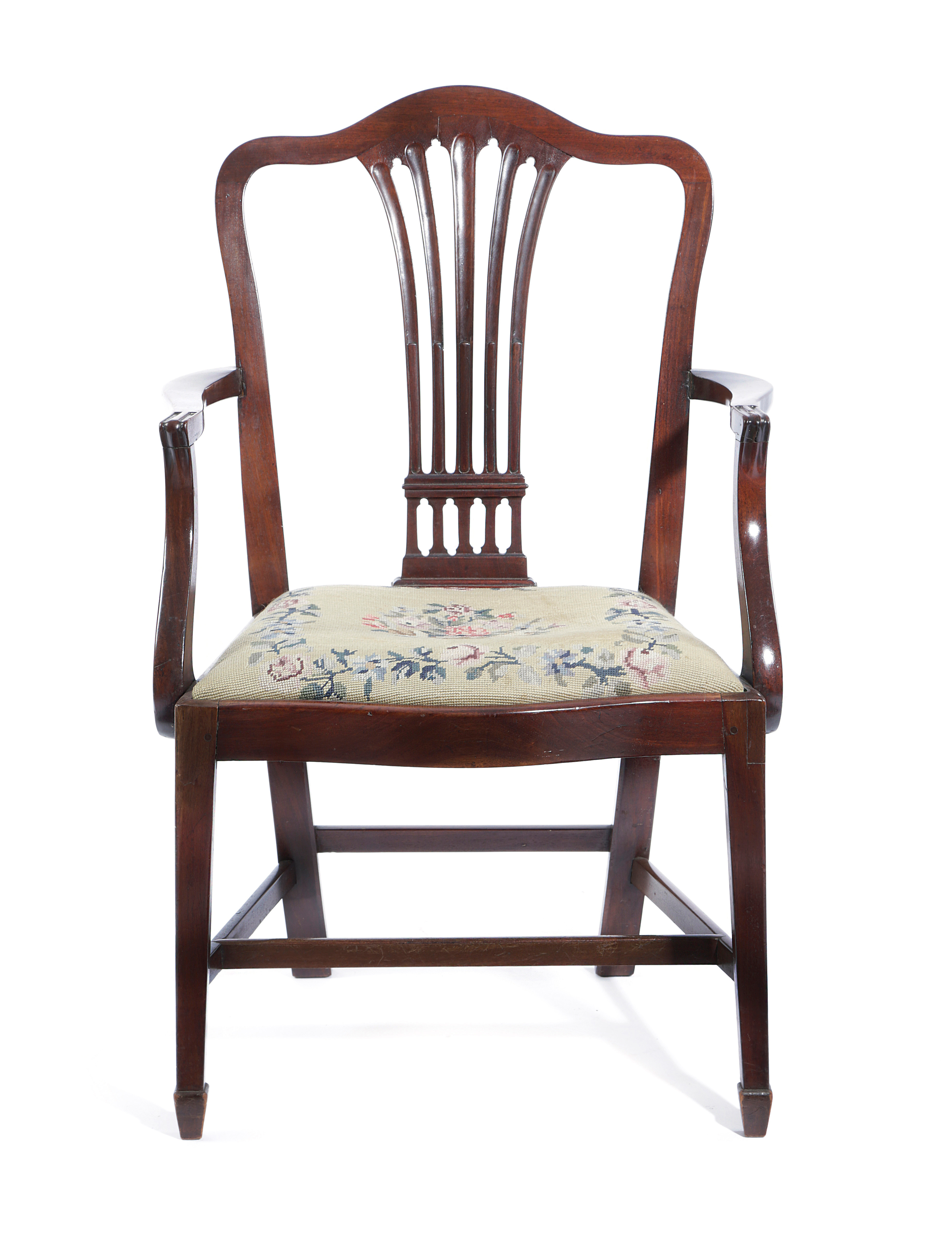 with a pierced fan shaped splat, above a drop-in needlework seat