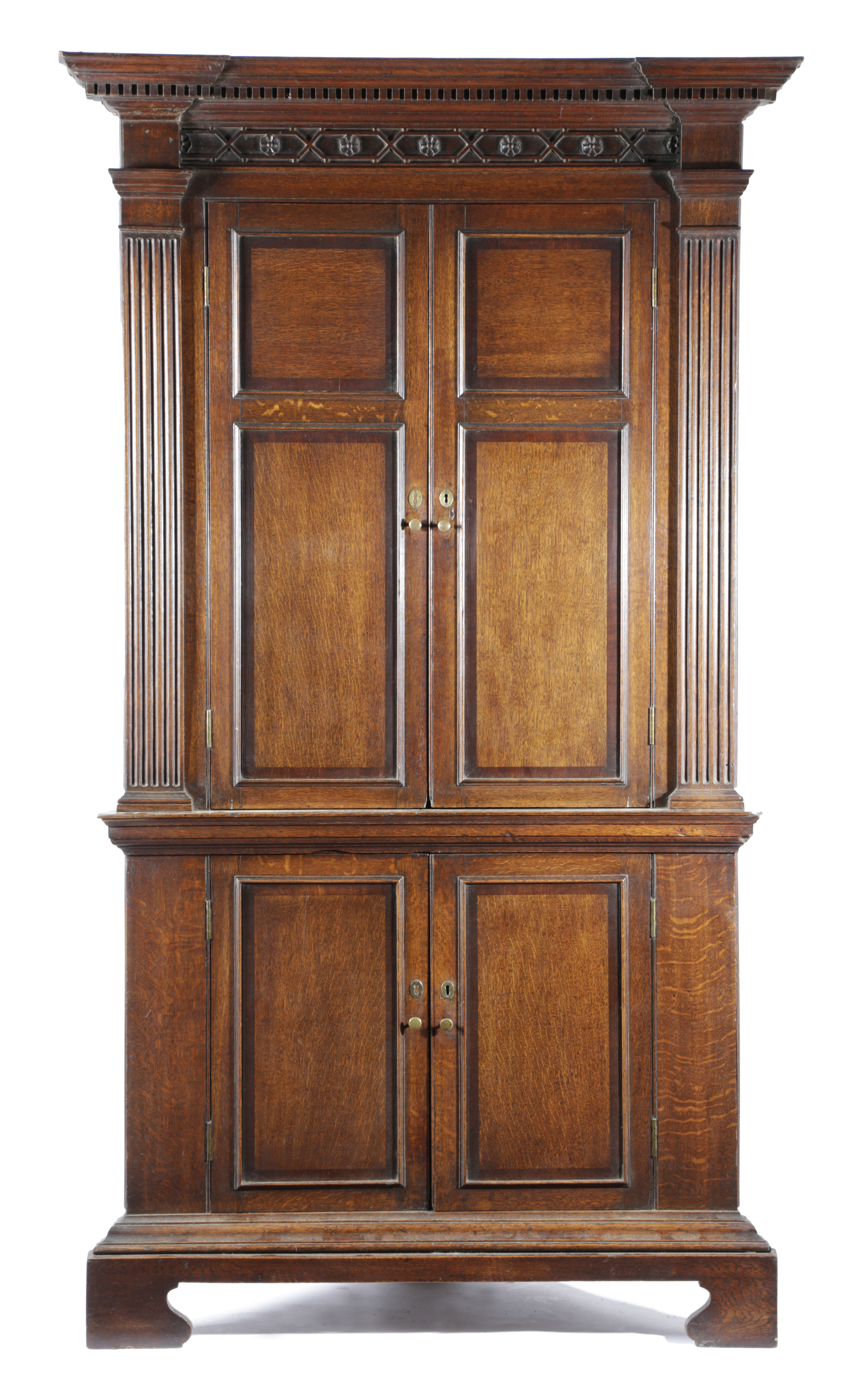 A GEORGE III OAK STANDING CORNER CUPBOARD NORTH...