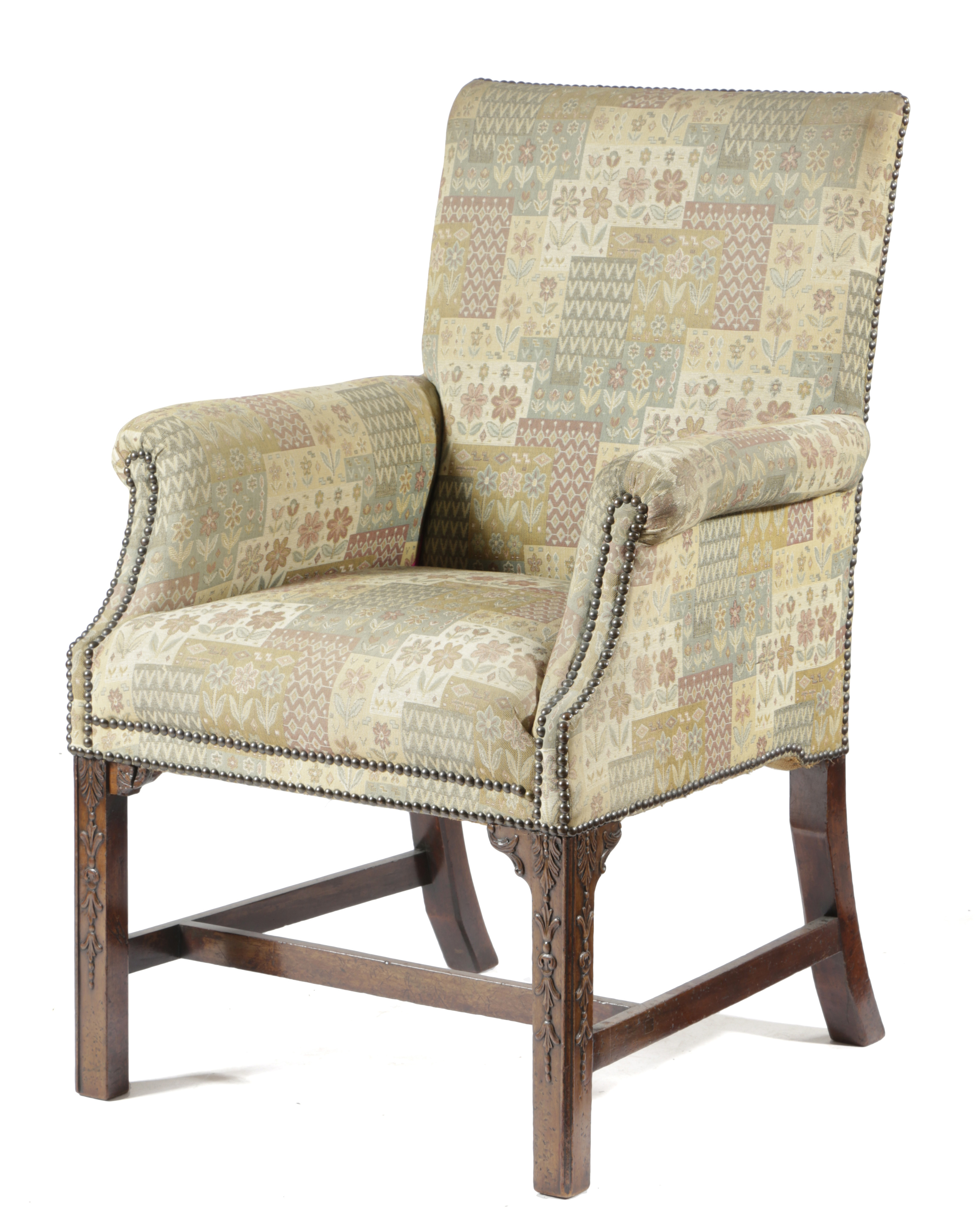 with later upholstery, the front legs carved with leaves and husks