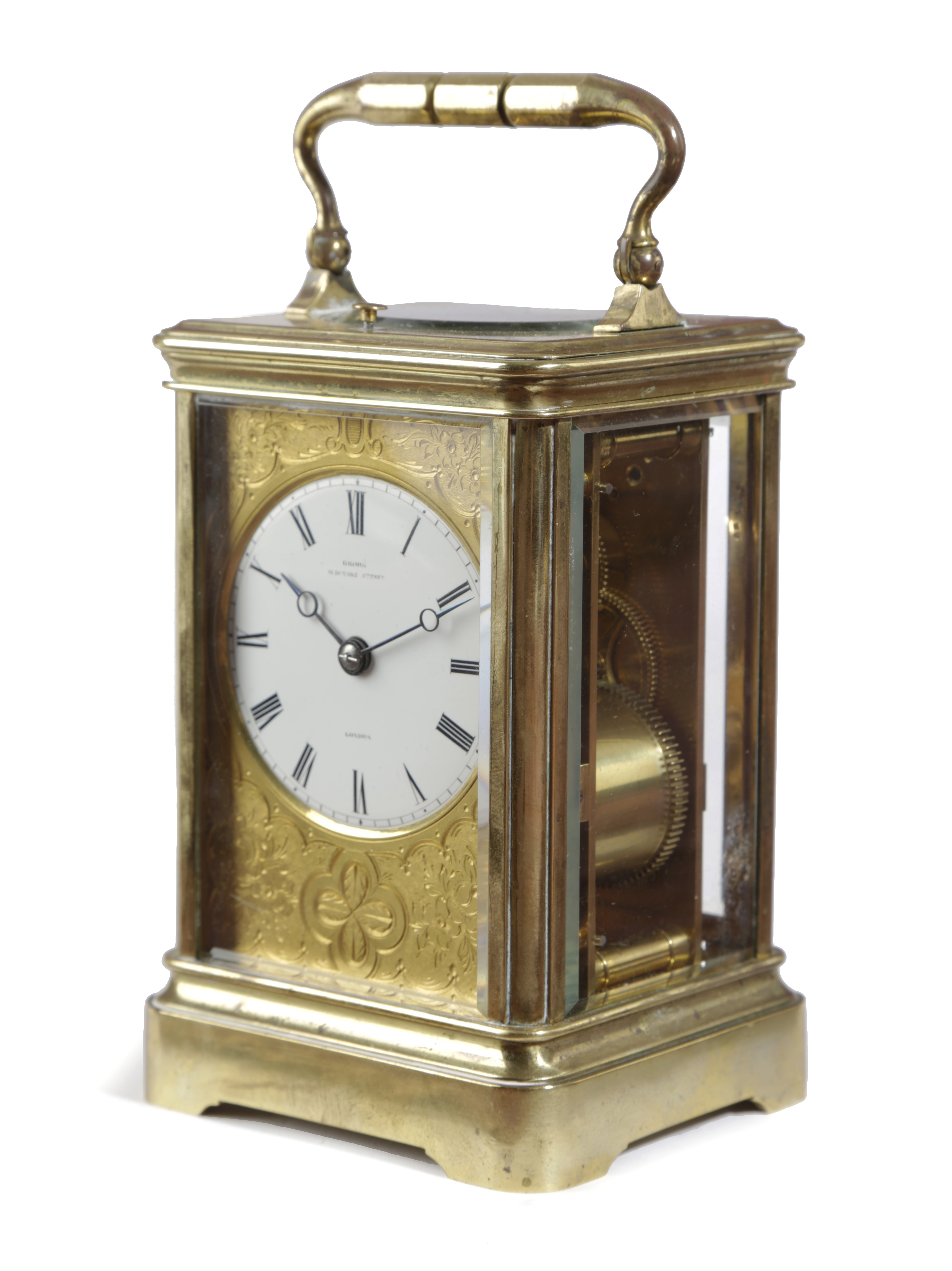 the brass eight day repeating movement with a platform lever escapement, striking half hourly on a bell, the backplate stamped '9821' and stamped 'D C', the enamelled dial with black Roman hours and inscribed 'Grohe, Wigmore Street, London', inside a foliate engraved frame, with a key