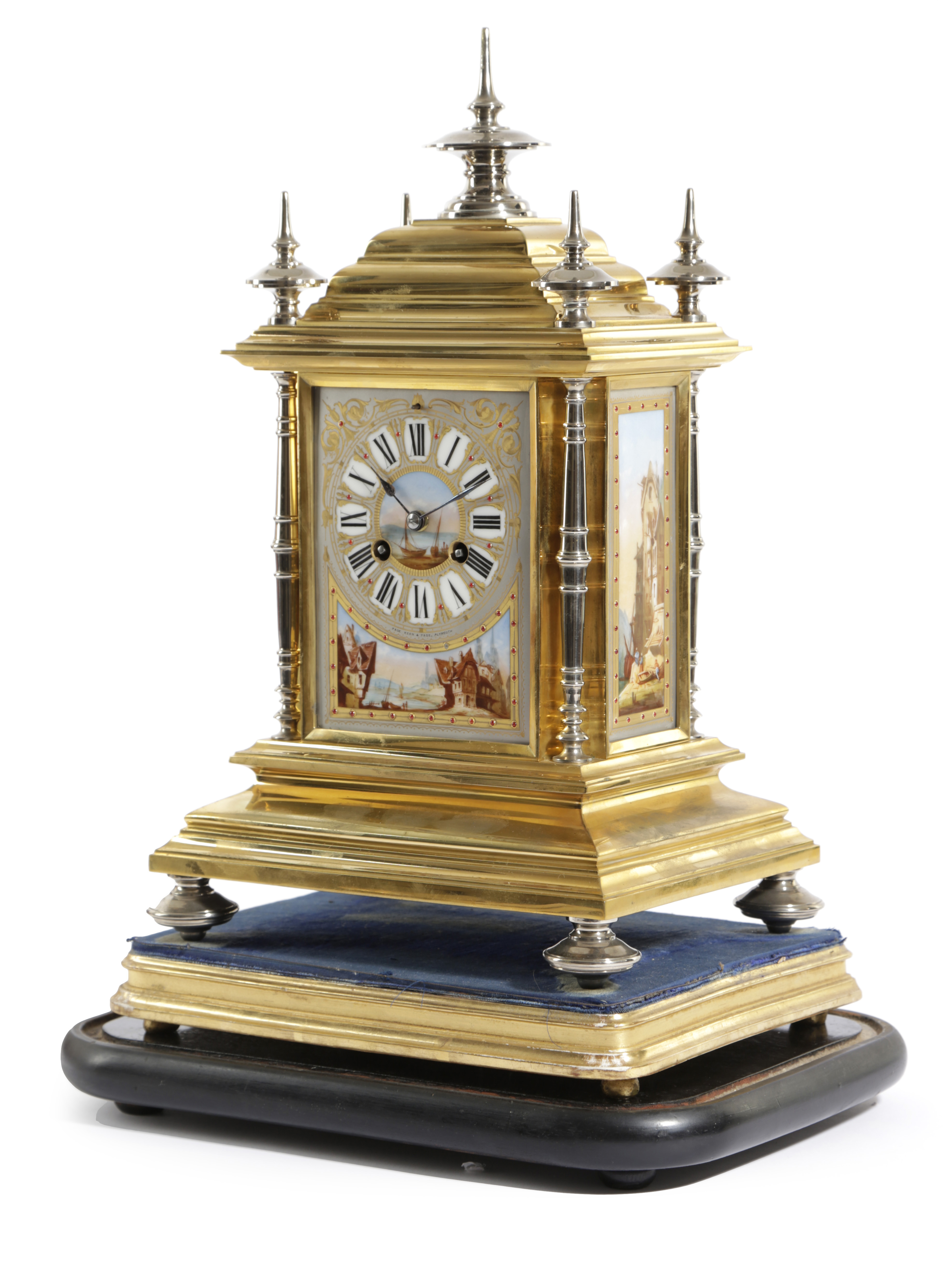 the brass eight day movement striking hourly on a bell stamped 'A*B 3748 178', the porcelain dial with black Roman numerals around a central painted coastal scene and on a gilt foliate ground, inscribed 'Page Keen & Page, Plymouth' above a coastal village scene, with red enamel jewelling, the sides with poreclain plaques painted with houses inside jewelled frames, the case with a caddy top with five turned finial above turned columns, with a stepped base and turned feet, on a later giltwood base, with key and pendulum