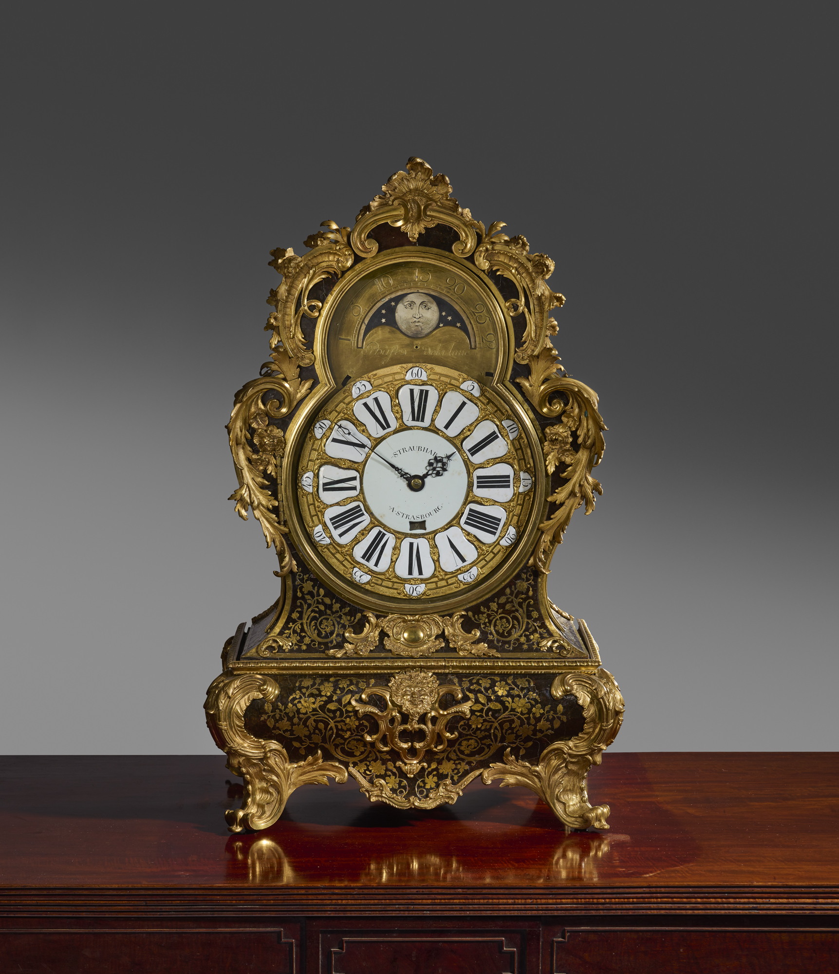 The inscription 'Straubhar A Strasbourg' on the dial refers to Johann Jakob Straubhaar, a clockmaker active in Strasbourg between around 1720 and 1750.
