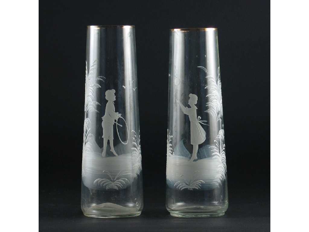 A pair of Mary Gregory glass vases, of a girl and a boy playing, 25cm. (2)