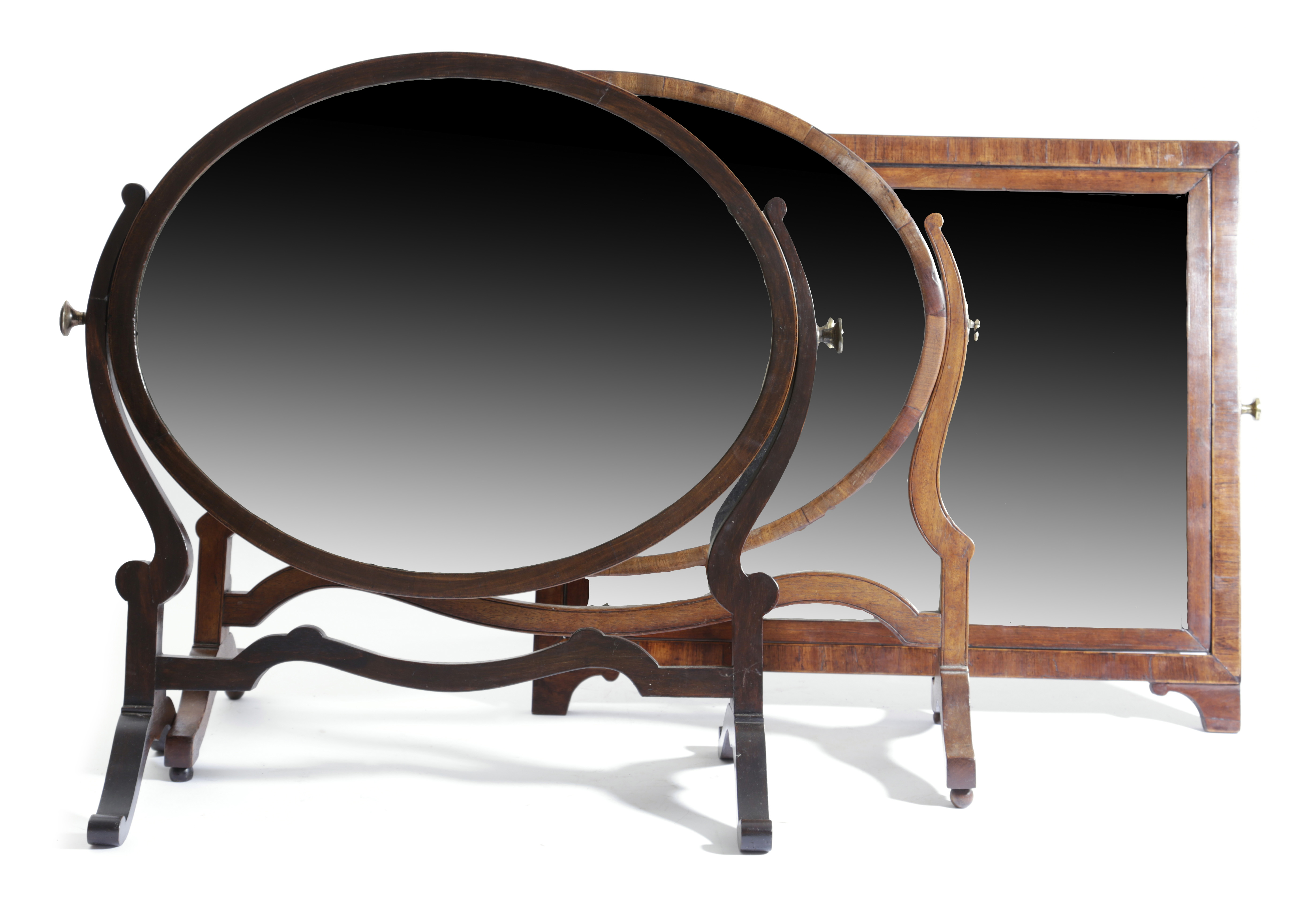the rectangular plate on an easel style frame, together with two mahogany dressing table mirriors with oval plates on scrolling supports (3)