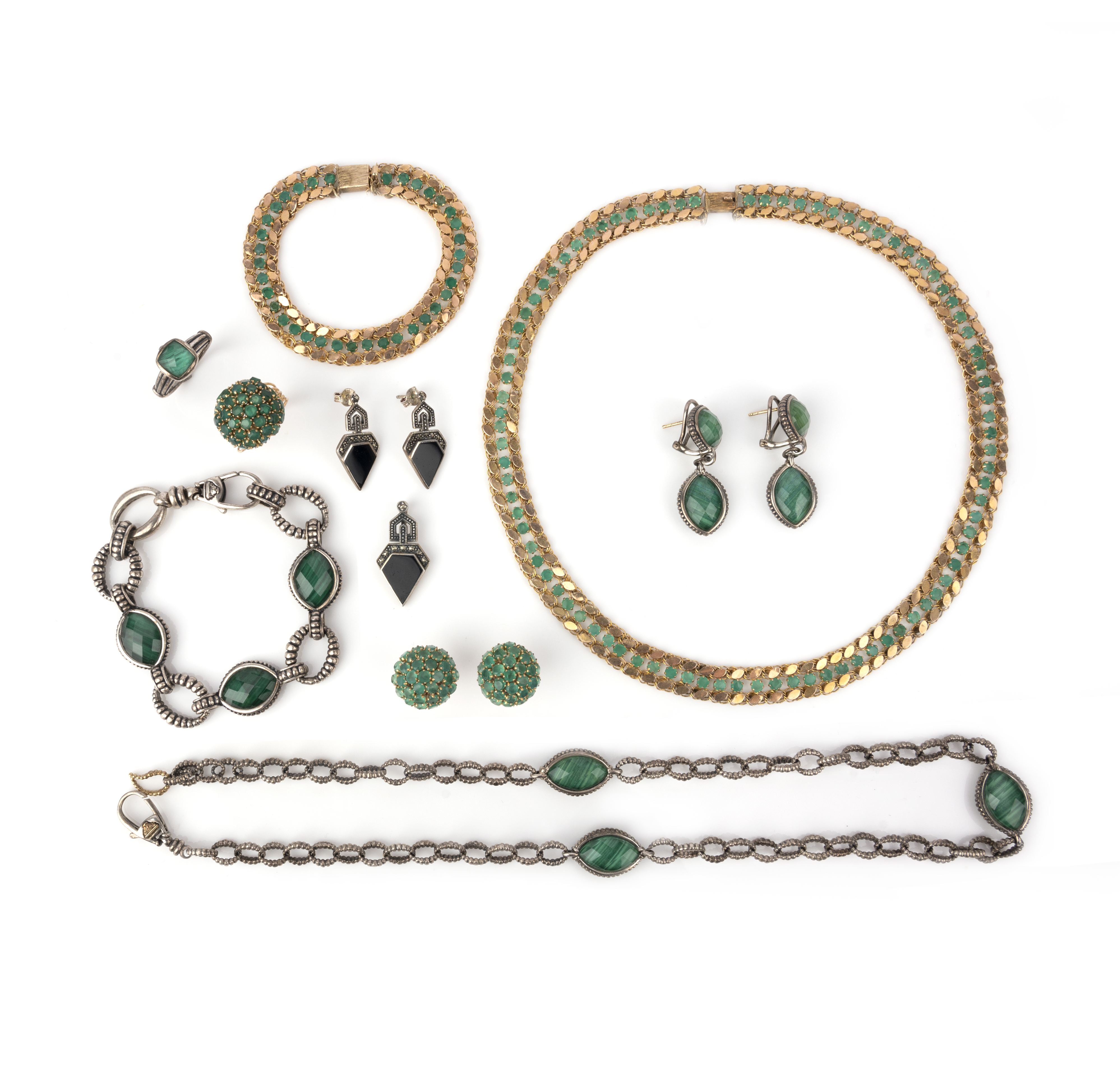 A collection of jewellery including a dyed green chalcedony demi-parure, comprising: a gold necklace and bracelet, each composed of fancy gold linking set with a central line of circular-cut chalcedony, necklace length 44.2cm, bracelet length 17.5cm; a pair of earrings and a ring en suite, each of bombé design, set with circular-cut chalcedony, earrings 16cm diameter each, post fittings, ring size N; a silver parure set with imitation malachite behind faceted glass; and a silver, onyx and marcasite demi-parure