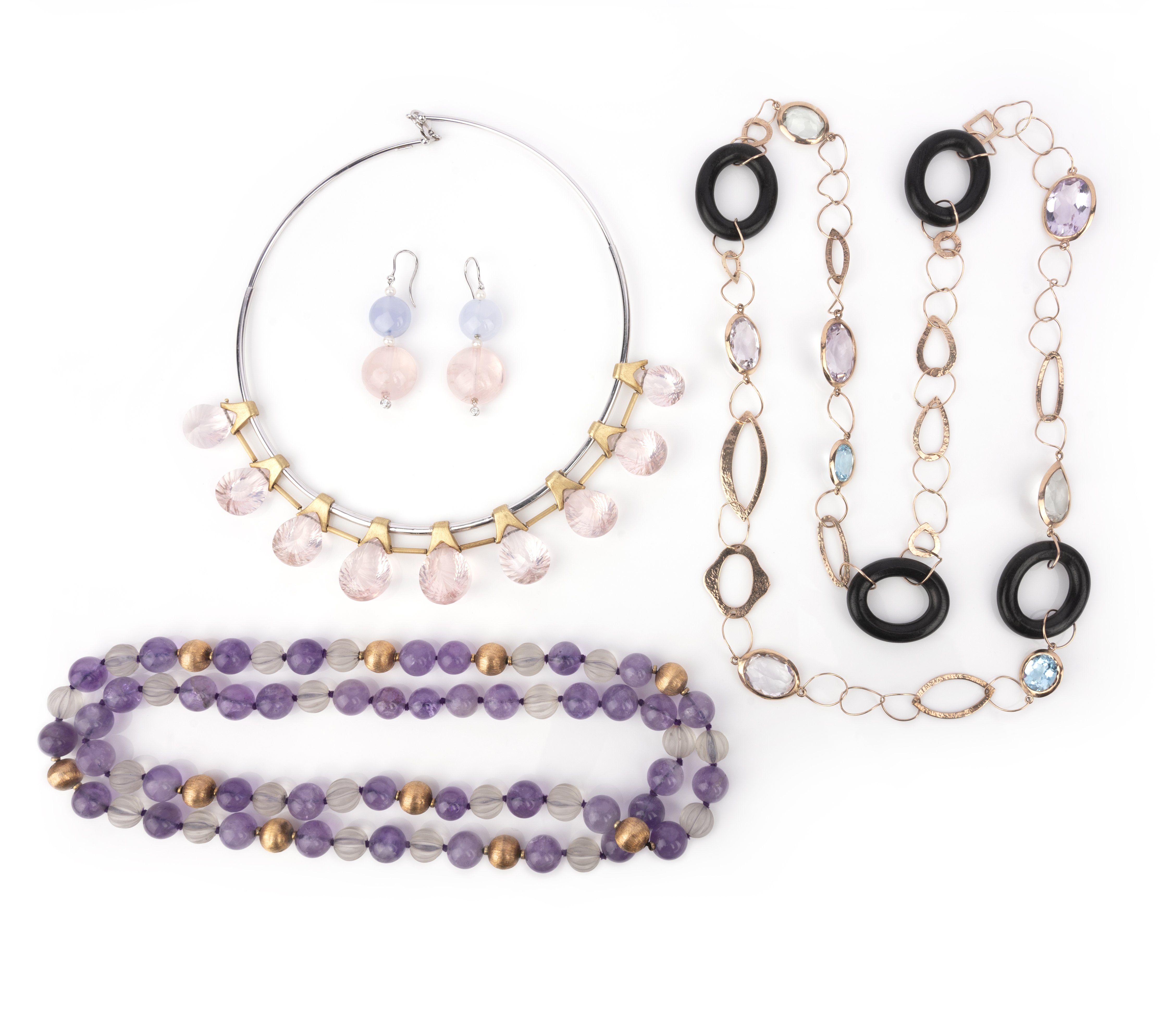 A collection of jewellery, comprising: a collar suspending a fringe of pear-shaped rose quartz pendants, inner circumference 38cm, Italian maker's mark, stamped 750; a pair of drop earrings set with polished blue chalcedony and rose quartz, accented with cultured pearls and brilliant-cut diamonds, hook fittings; a necklace composed of variously-shaped gold links, wooden hoops and spectacle-set links of oval rock crystal, amethyst and blue topaz, length 86cm, stamped 375, French import assay marks for 9ct gold; and a necklace composed of fluted rock crystal beads, spherical amethst beads and brushed gold beads, length 87cm