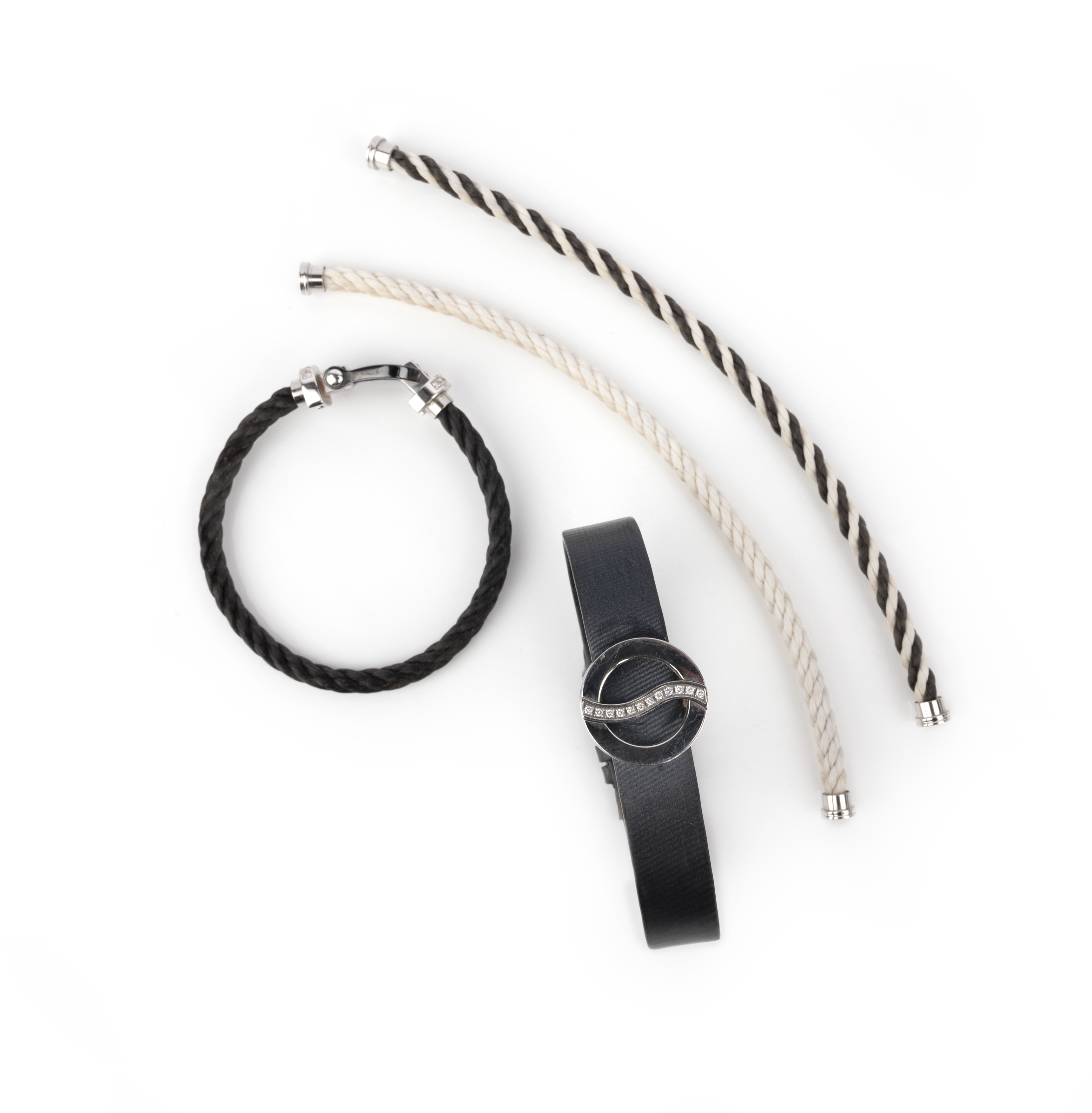 Fred, a diamond bracelet, 'Force 10', the black cord bracelet to a clasp set with brilliant-cut diamonds, length 17.5cm, signed Fred, numbered 952567, stamped Au750, two extra interchangable cord bracelets, pouch stamped Fred; together with a satinless steel and diamond 'Horizon' bracelet by Philip Stein, to a leather strap, length adjustable