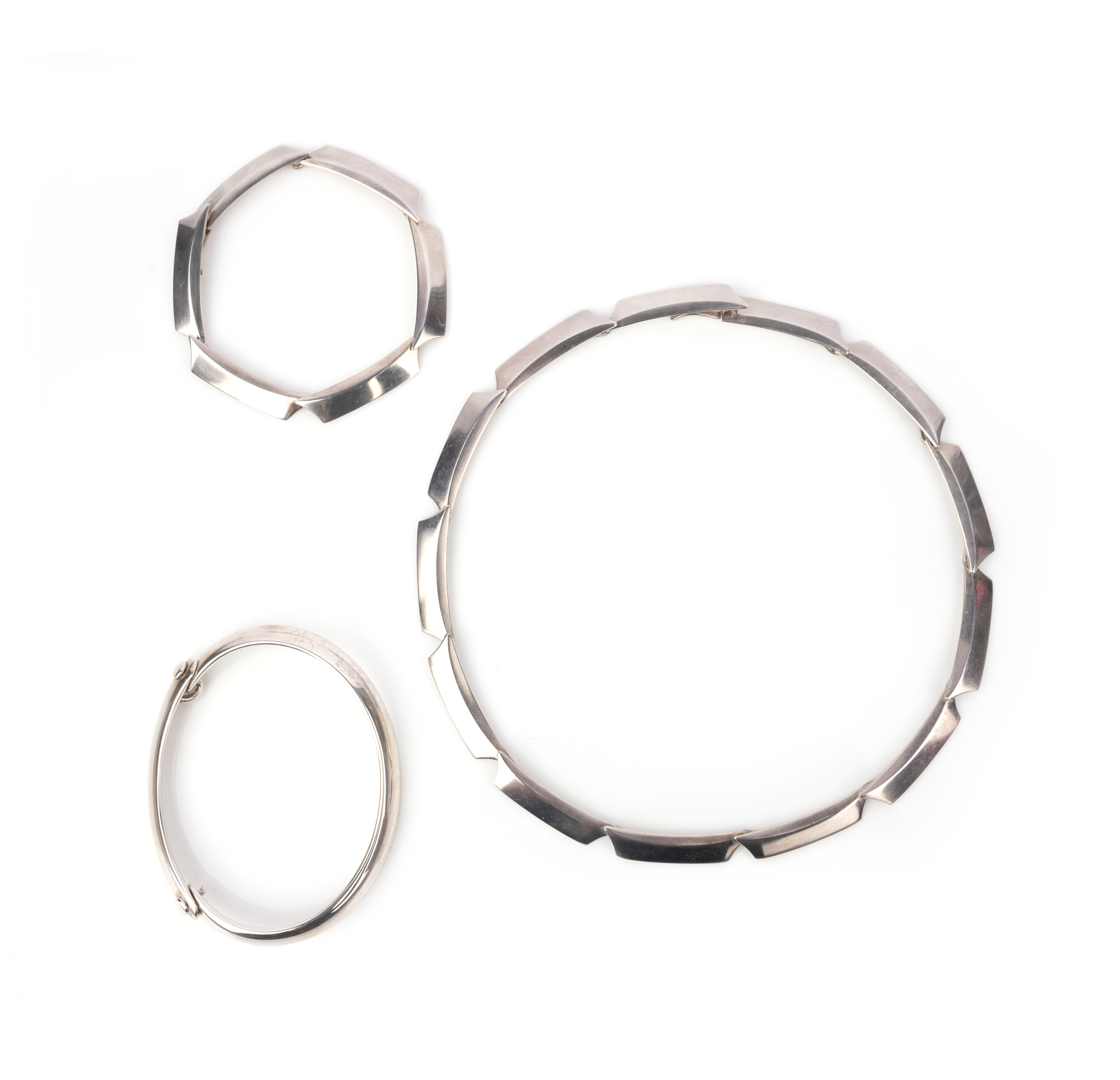 Georg Jensen, a silver bracelet, bangle and necklace, comprising: a hinged bangle, inner circumference 17.5cm, and a link necklace and bracelet, necklace length 39cm, bracelet length 17.5cm, each signed Georg Jensen, each marked 925S for silver, bracelet with British hallmarks, date letter for 2003, each with fitted case stamped Georg Jensen