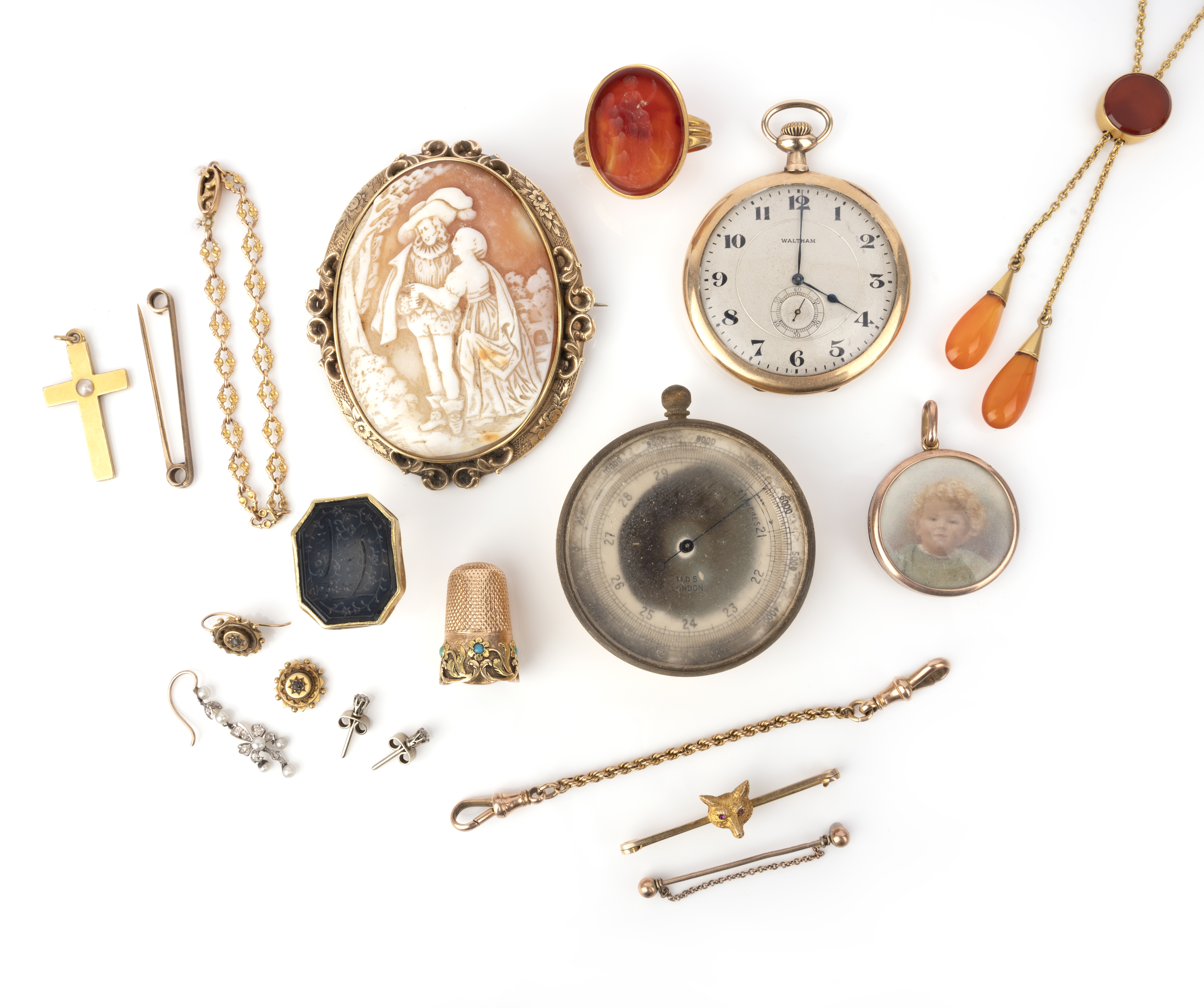 A mixed group of jewellery, comprising a carnelian-set gold long chain, a gold slide set with a carnelian intaglio, a gold ring set with an intaglio carved with an Islamic inscription, a gold locket pendant, a dress watch by Waltham, a Victorian shell cameo in a scrolling gold frame, a gold bracelet, a gold chain, a gold thimble, three gold brooches, a pair of diamond studs, one diamond earring and a pair of damaged gold earrings, a gold cross pendant and a barometer