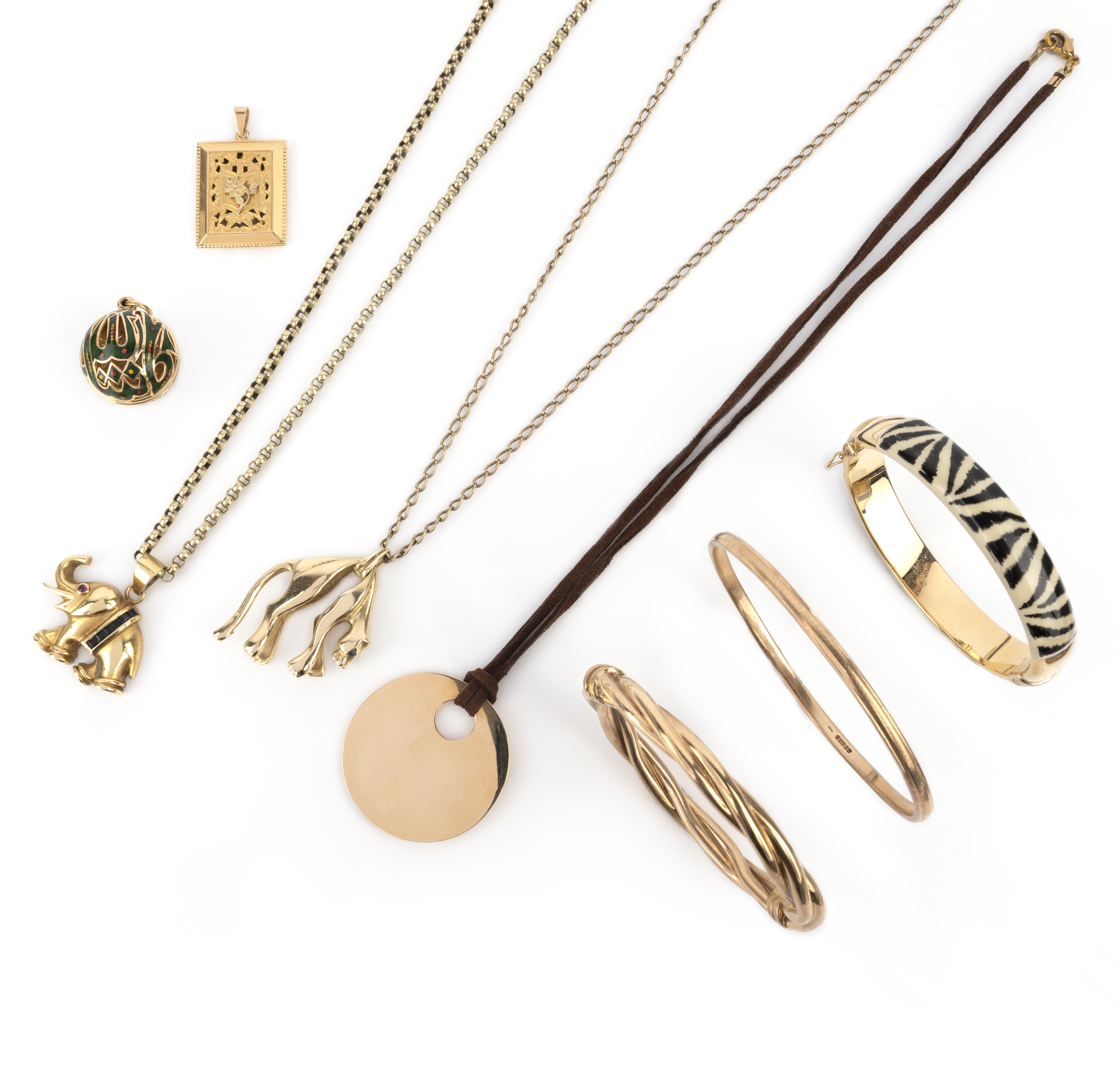 A collection of gold jewels, comprising: an enamelled bangle of zebra stripe design, marked 750, Italy; a plain solid bangle, British hallmarks for 9ct gold; a bangle of rope twist design, stamped 975, Italian maker's mark; a gold and enamel pendant opening to reveal an Arabic inscription; a gold panther pendant, stamped 585; suspended from a 9ct gold chain, British hallmark; a rectangular gold pendant with a design of floral openwork; a gold pendant depicting an elephant, set with calibré-cut sapphires and a cabochon ruby eye, stamped CETAS 750, to a belcher link chain necklace, stamped 585; and a gold disc pendant to a cord necklace, pendant stamped 750