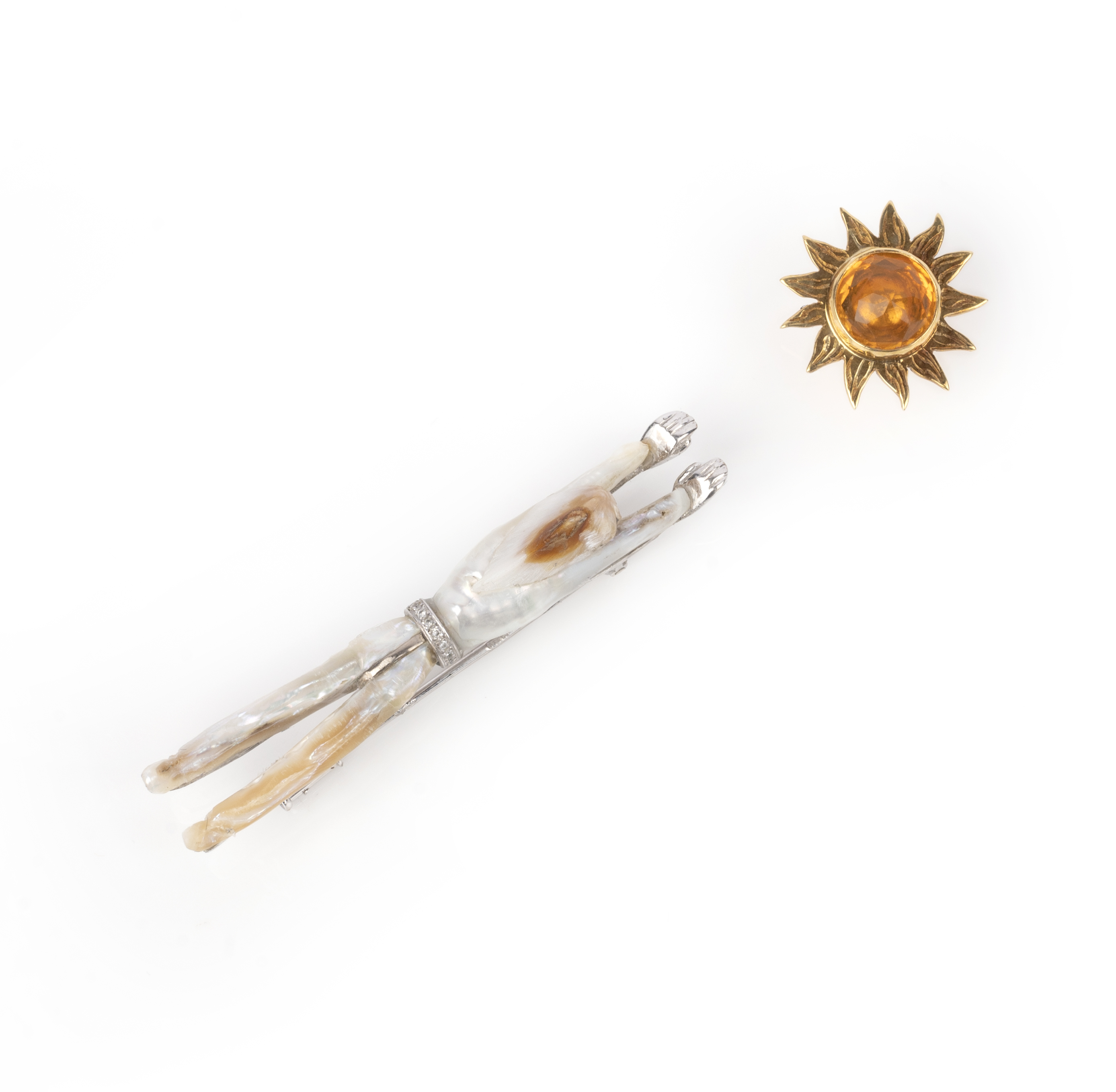 Geoff Rowlandson, a cultured pearl, diamond and fire opal 'Sun Worshipper' brooch, designed as a sunbathing figure composed of a baroque freshwater cultured pearl, accented with diamonds, reaching for a separate sun brooch, set with a faceted fire opal, mounted in gold, figural brooch length 5.7cm, signed G. Rowlandson, inscribed 'Here Comes the Sun', British hallmarks for 18ct gold, sun brooch 2cm diameter, partial British hallmark for 18ct gold, fitted case stamped Geoff Rowlandson