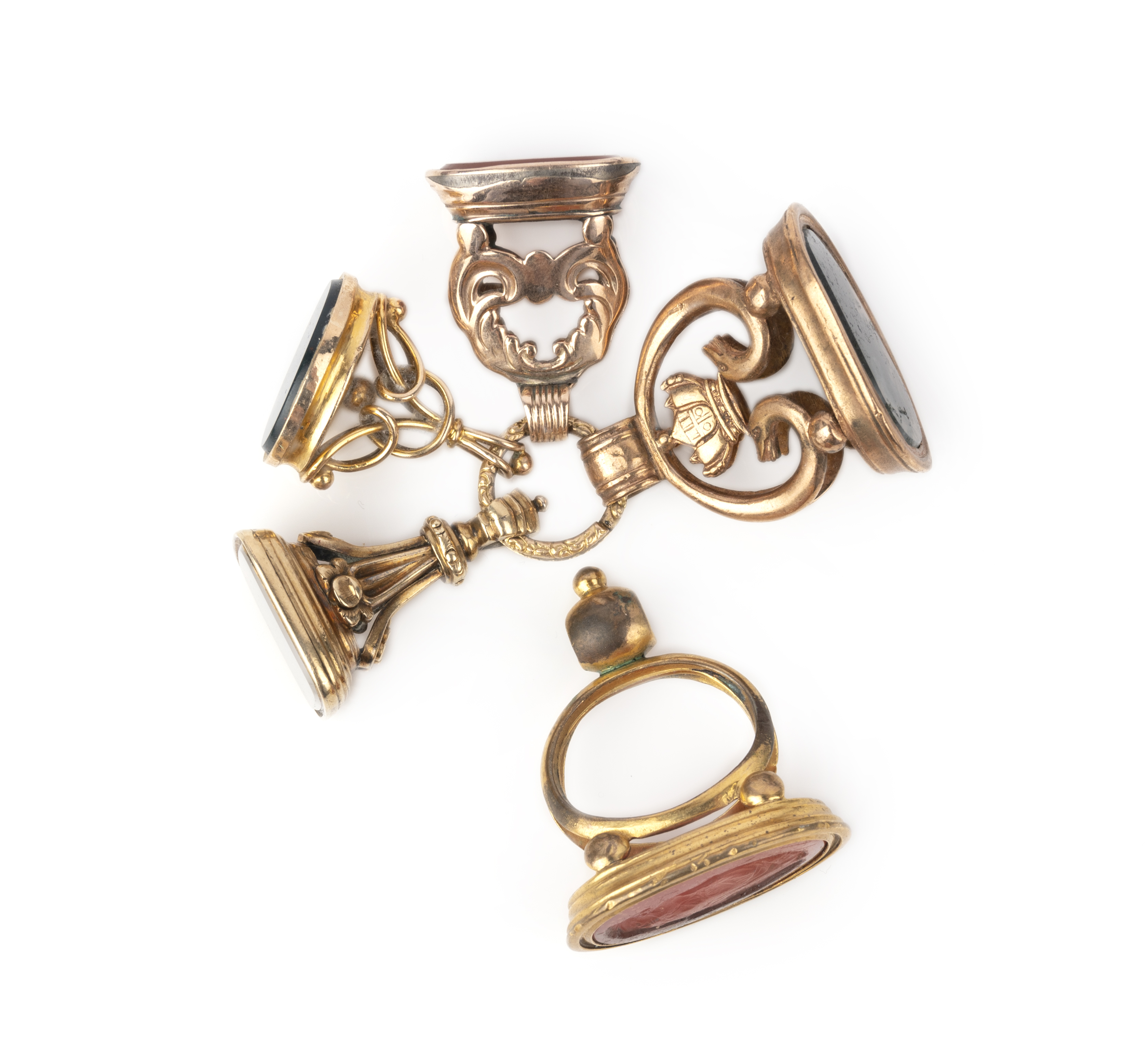 A collection of fob seals, late 19th/early 20th century, the five fob seals set respectively with polished carnelian engraved with the letter R, plain polished sections of moss agate, bloodstone and white chalcedony, and a moulded glass intaglio imitating carnelian, two mounted in gilt metal, three mounted in gold, to a gold connecting hoop, tallest 3.8cm, one with Chester hallmark for 9ct gold, date latter for 1924