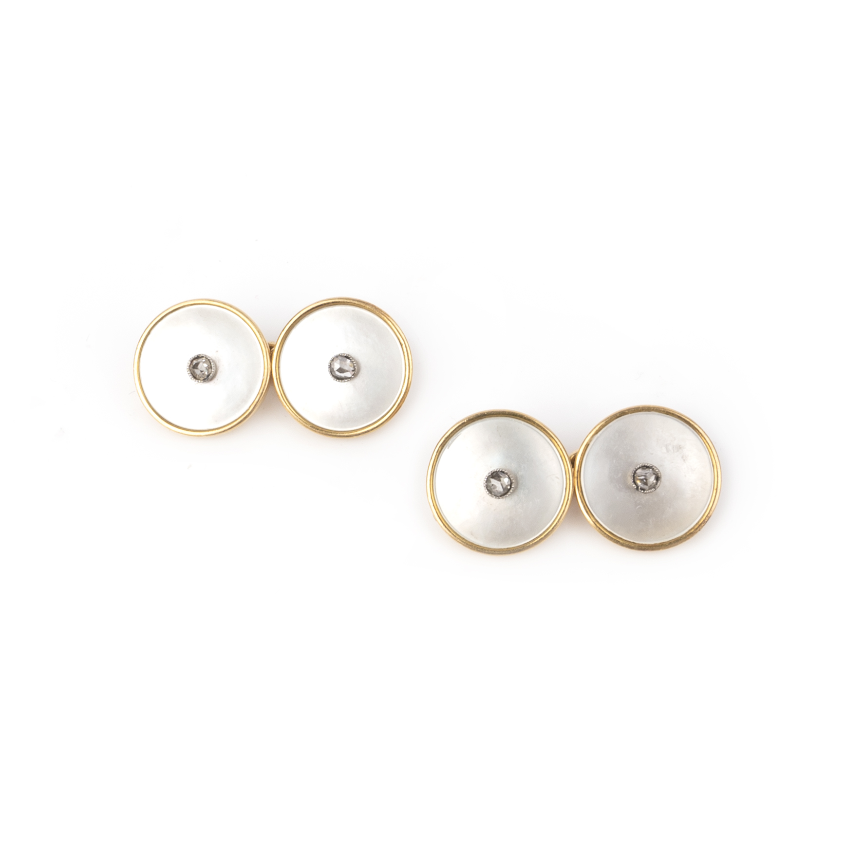 A pair of mother of pearl and diamond cufflinks, France, early 20th century, each end composed of a mother of pearl disc inset with a rose-cut diamond, to chain connectors, mounted in gold, each end 1.3cm diameter, French export assay marks for 18ct gold, French maker's mark
