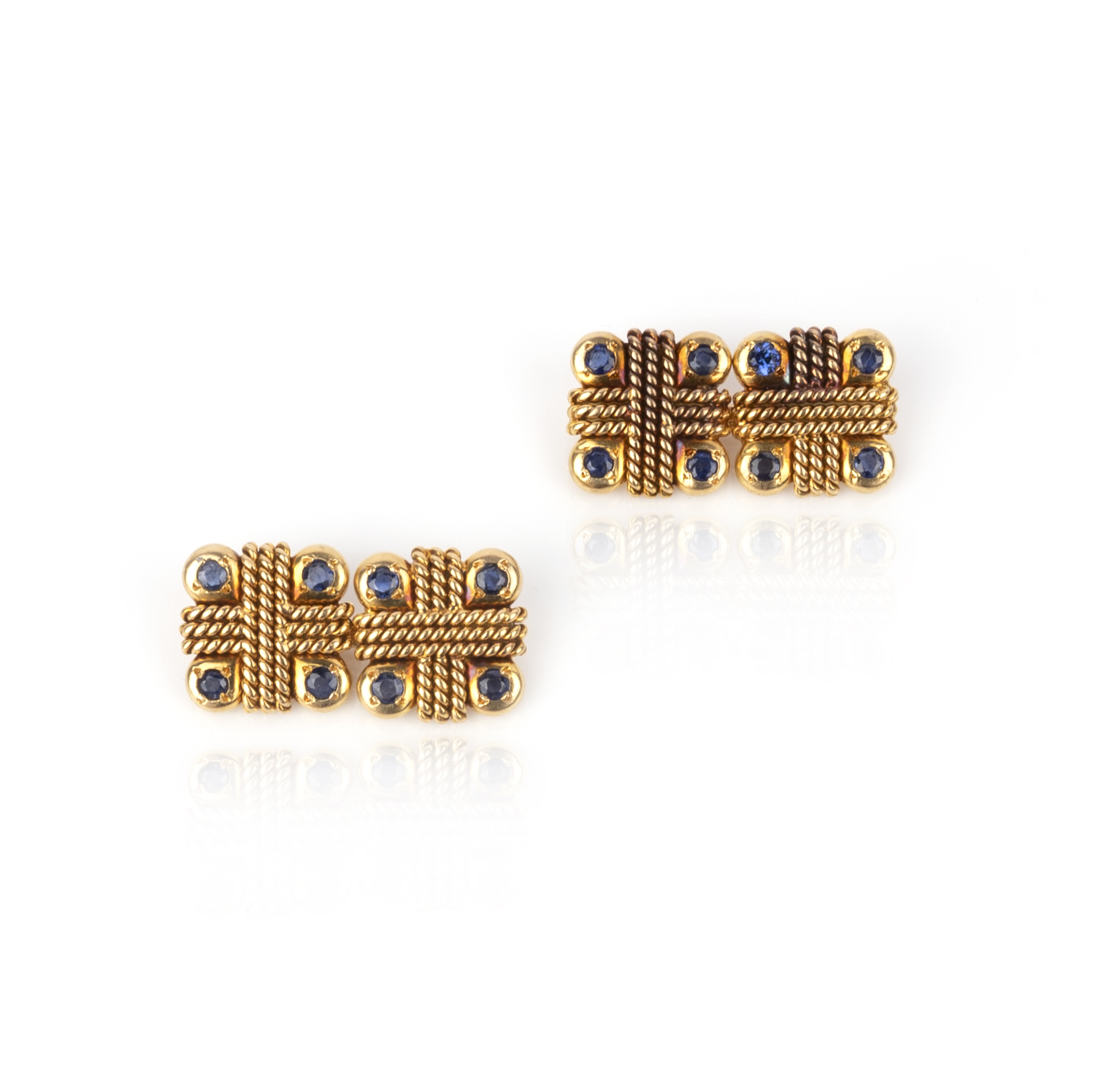 A pair of gold and sapphire cufflinks, each end of square outline with rope twist details, each corner set with a circular-cut sapphire, each end 1.2 x 1.2cm, connectors stamped 18K, case stamped Asprey & Co