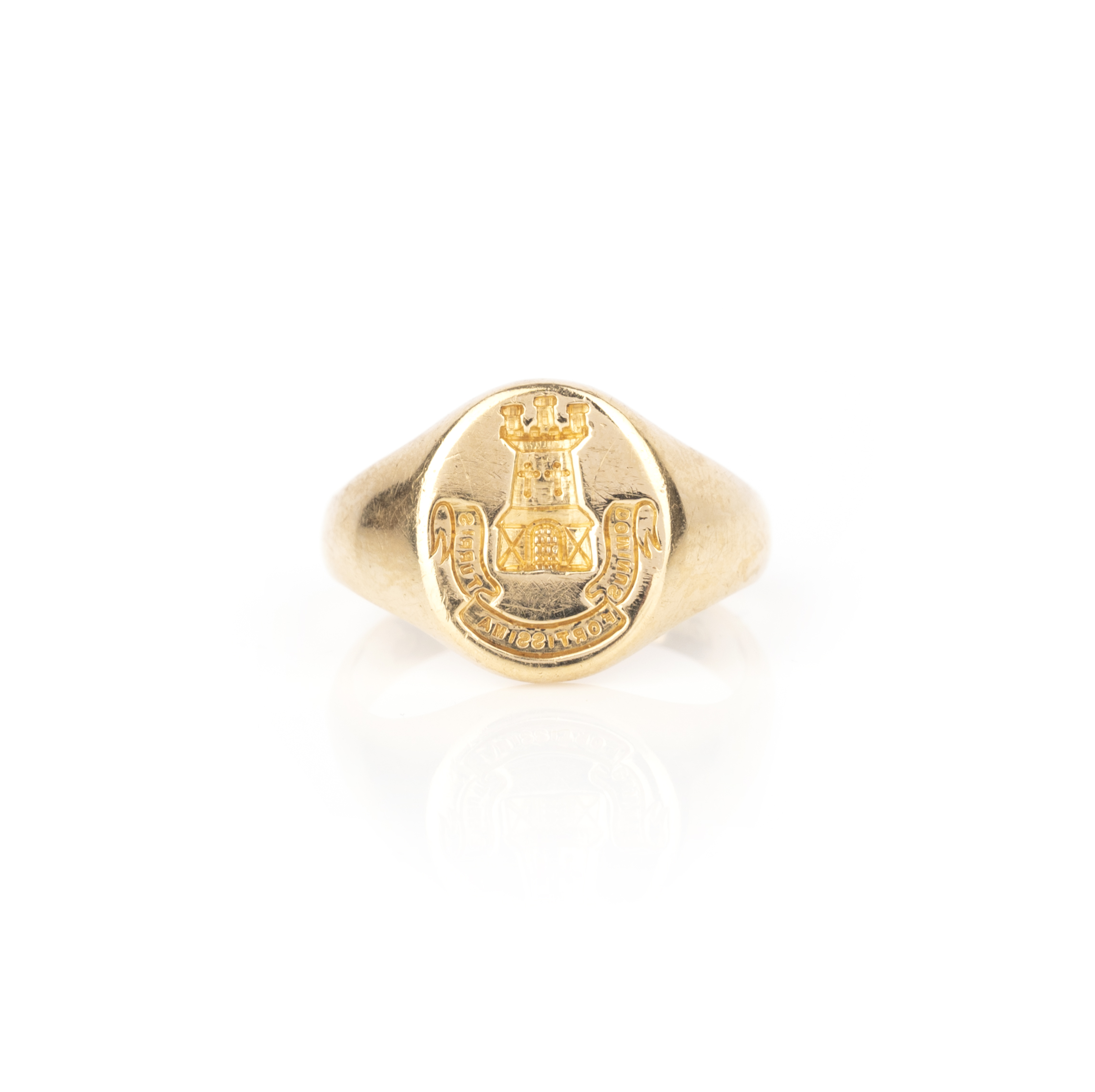 A gold signet ring, engraved with the arms of the de Havilland family, depicting a tower over a ribbon bearing the motto 'Dominus Fortissima Turris', or 'the Lord is the Strongest Tower', size R1/2, British hallmarks for 18ct gold, date letter for 1992, gross weight 10 grams