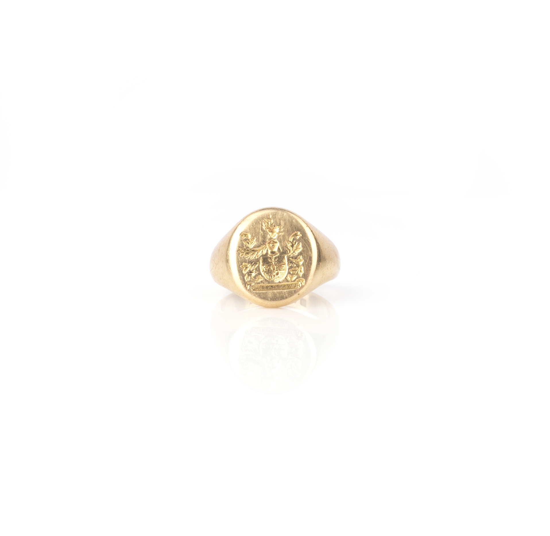 A gold signet ring, circa 1928, engraved with a coat of arms, bearing the motto 'HUMAN NIHIL ALIENUM', meaning 'nothing human is alien to me', in 18ct gold, size L, British hallmarks, date letter for 1928