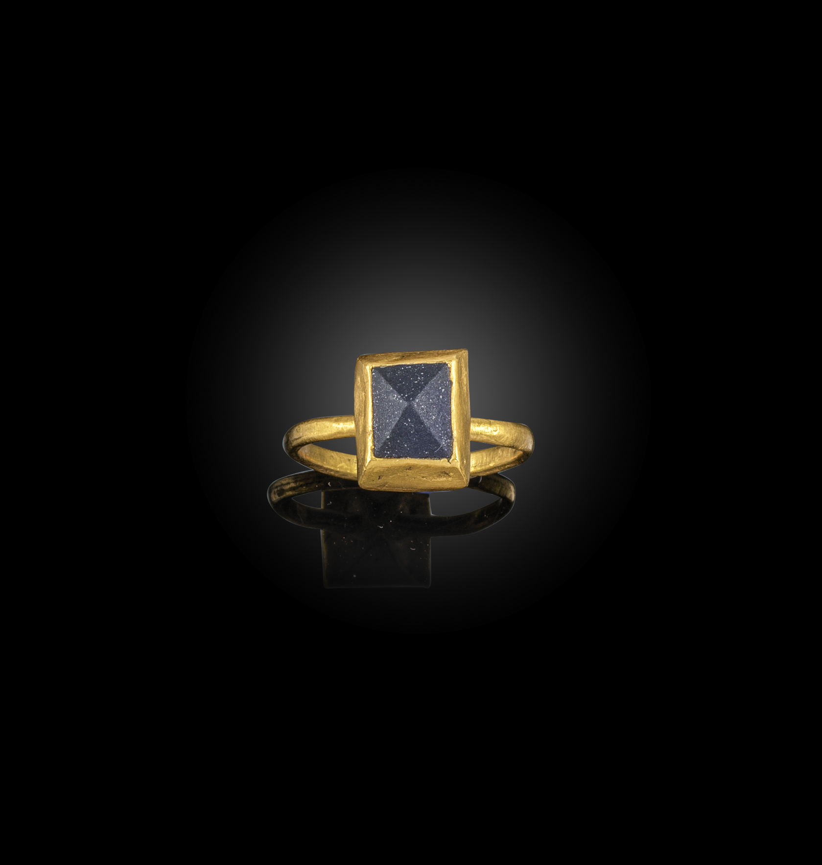 A glass-set gold ring, the pyramid-shaped glass rubover-set in plain gold mount, size N