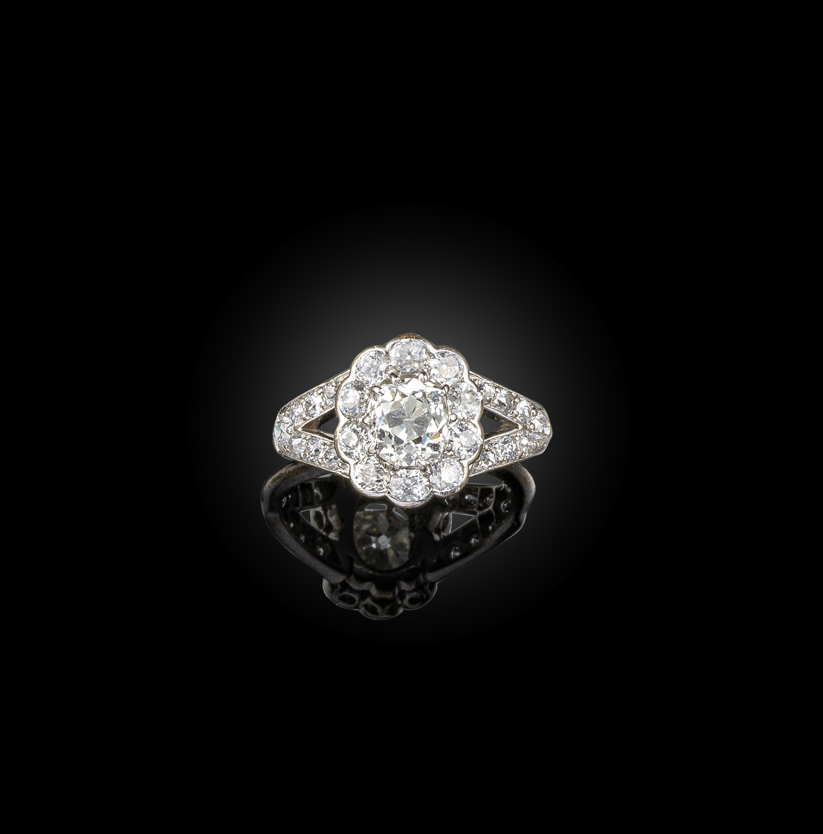 Theodore B. Starr, a diamond ring, early 20th century, claw-set with a cushion-shaped diamond weighing approximately 1.20 carats, to a border and shoulders set with cushion-shaped diamonds, mounted in white gold, size Q, signed TB Starr