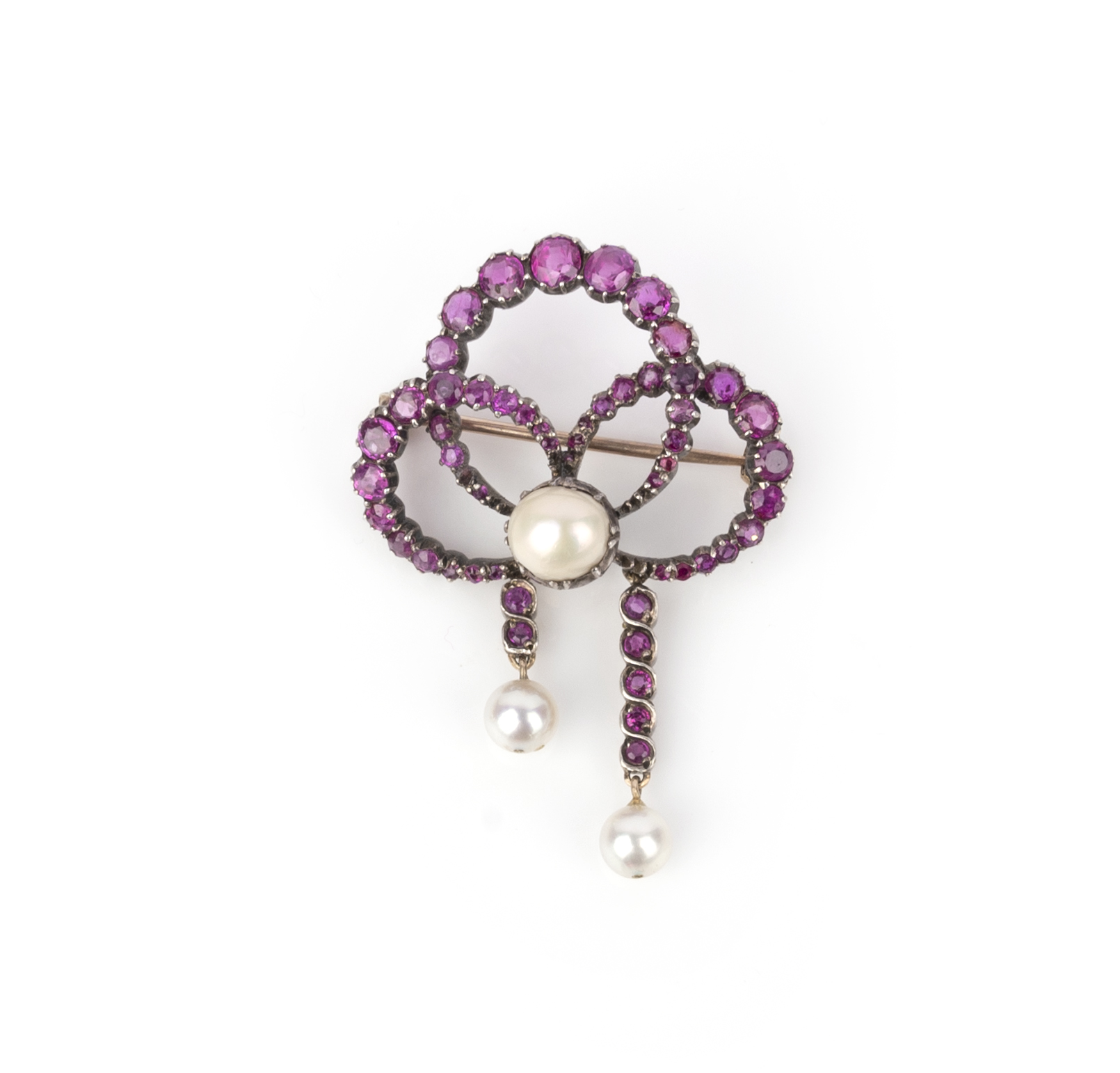 A late 19th century (composite) pink sapphire and cultured pearl brooch, the three interlocking circles set with pink sapphires, suspending two pink sapphire and cultured pearl drops in silver and gold, width 3.2cm