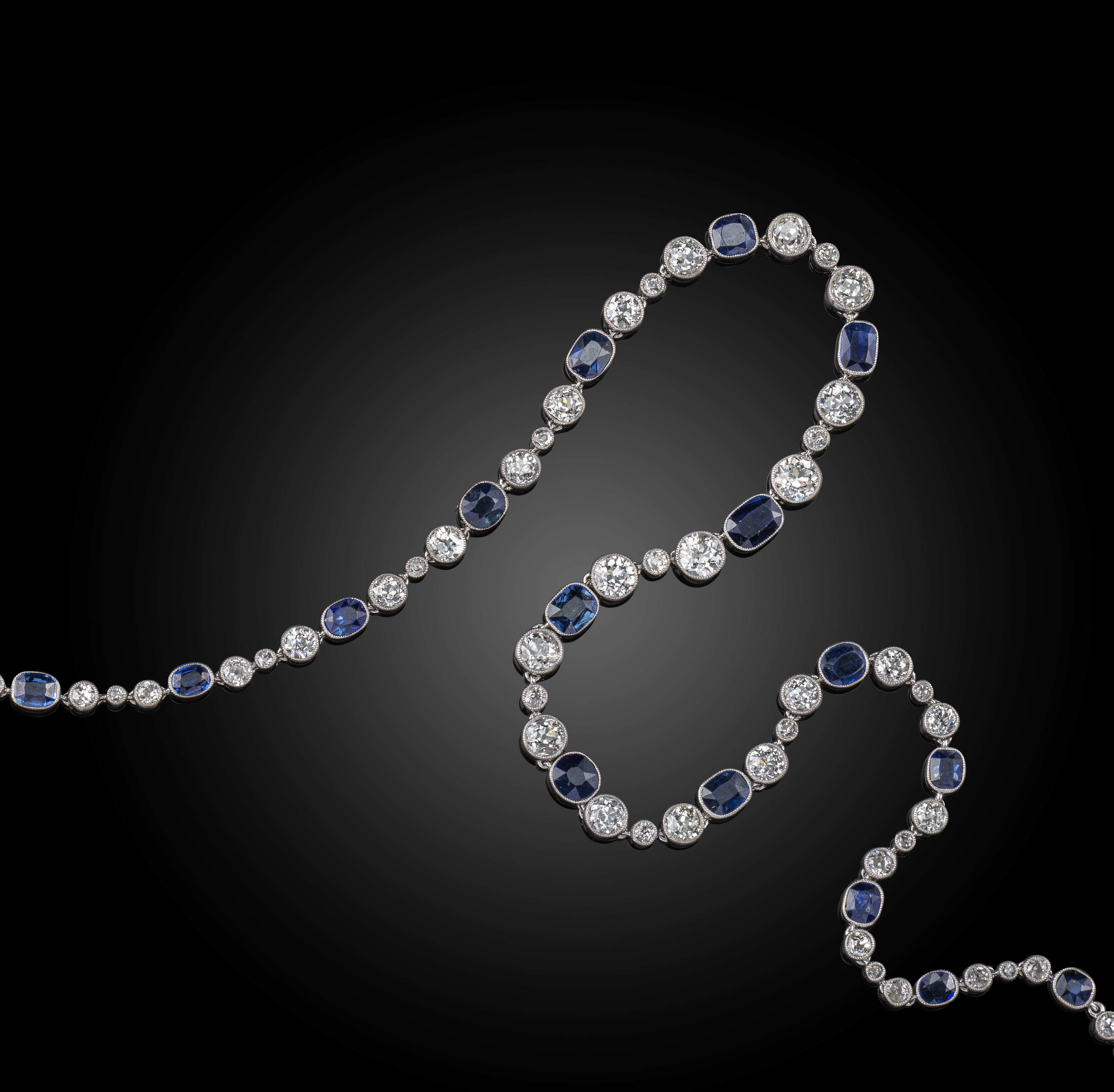 A sapphire and diamond necklace, early 20th century, composed of millegrain-set circular-cut diamonds and cushion-shaped sapphires, to a sapphire and diamond clasp of cluster design, mounted in silver and gold, length 45.5cm, later rhodium plated