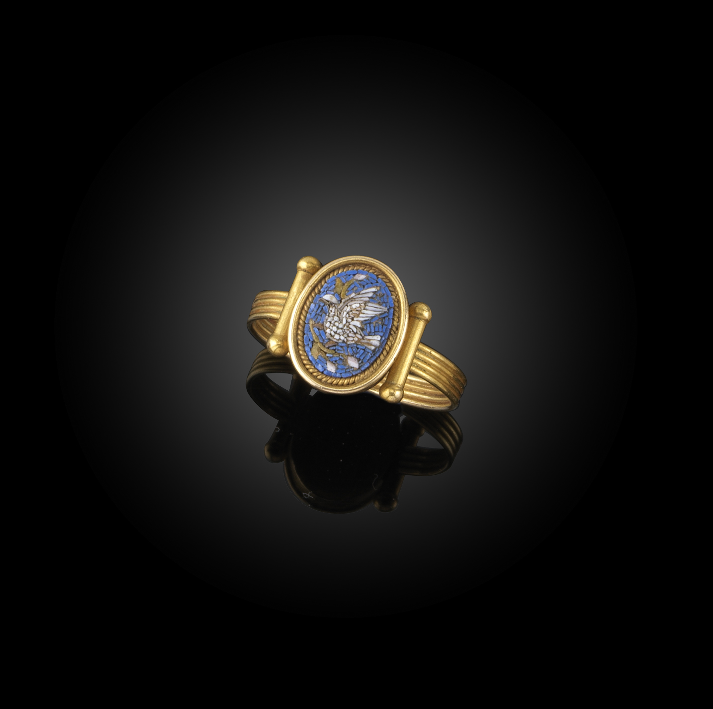 An Etruscan revival gold ring, C1900, in the Castellani manner, set with an oval micromosaic depicting a dove within gold stylised pillars on a gold wirework band, size K 1/2