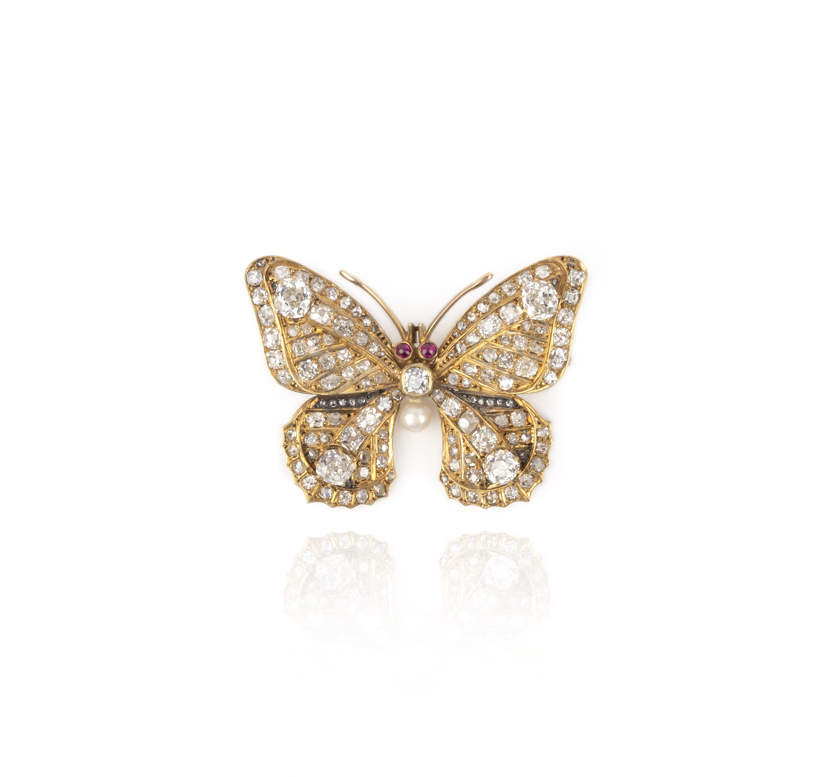 A late Victorian diamond butterfly brooch, set overall with diamonds, with ruby eyes and a pearl body in yellow gold, width 4cm, fitted case