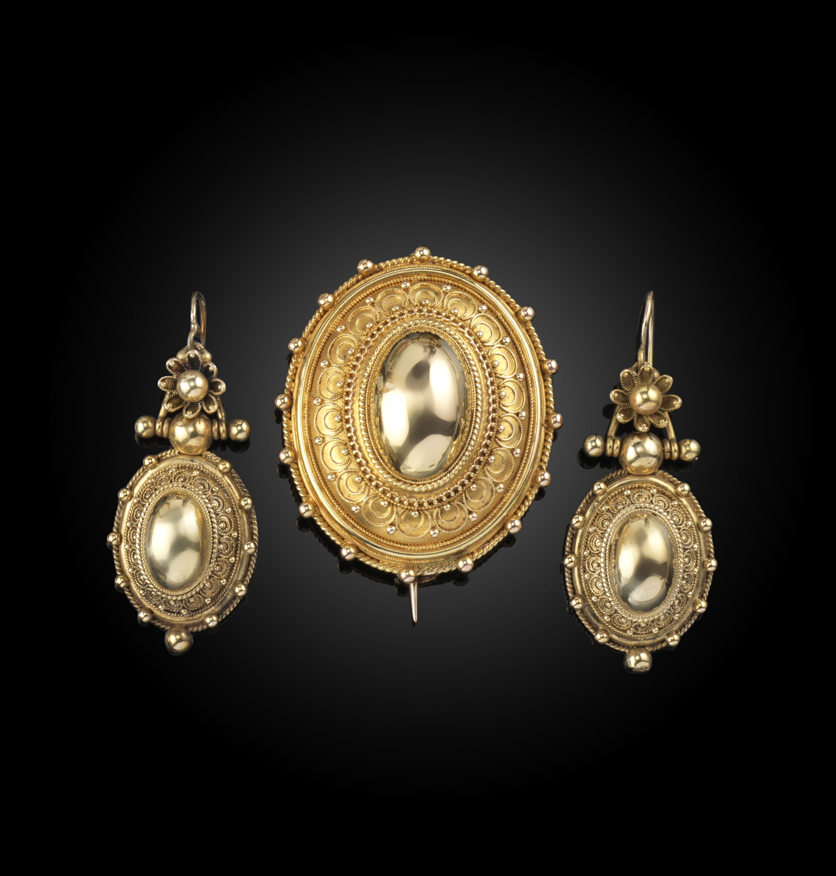 A late Victorian pair of gold earrings, of oval form with cannetille decoration, pellet and ropetwist borders suspended from flowerheads in yellow gold, length 5cm total, with a matching gold brooch with glazed locket compartment to reverse, length 4.4cm, fitted case